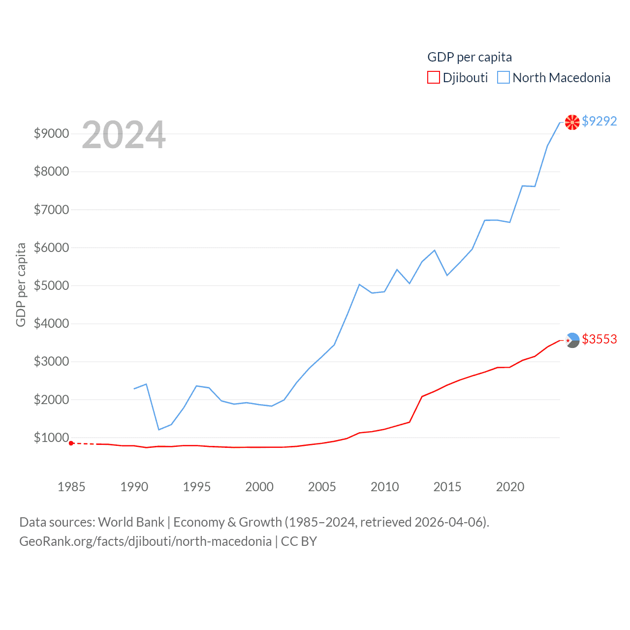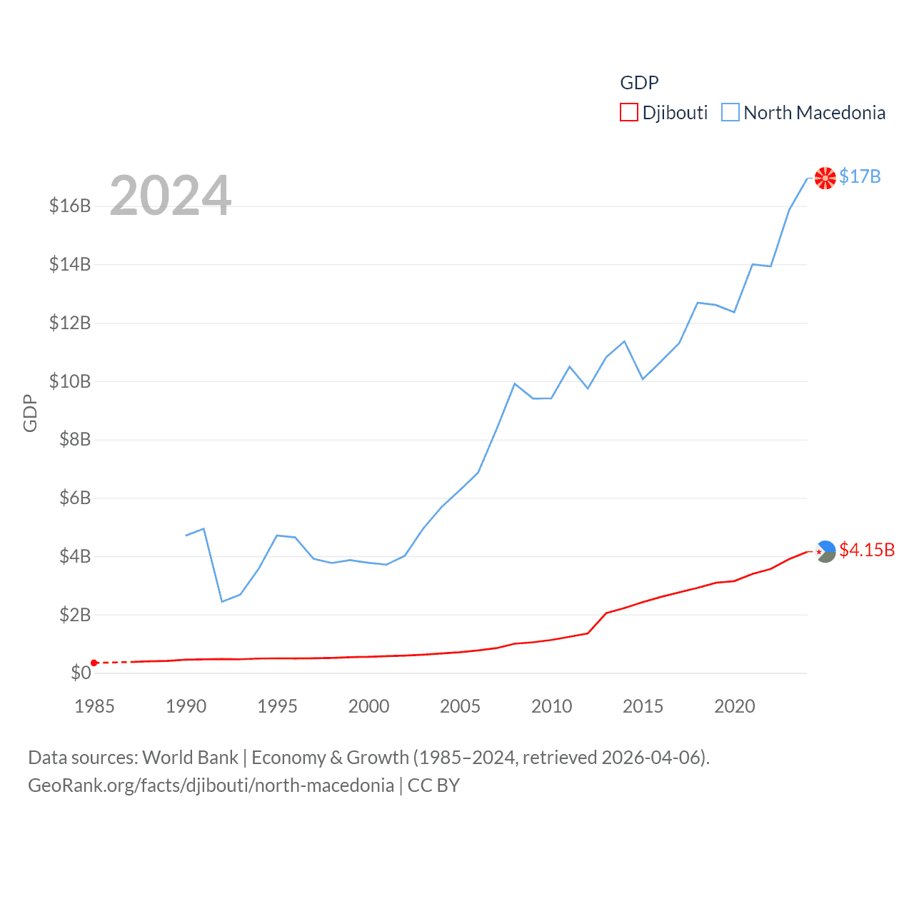 By GDP, Djibouti ranks 165/197 ($4.15B) and North Macedonia ranks 138/197 ($17B). By GDP per capita, Djibouti ranks 133/197 ($3,553), while North Macedonia ranks 88/197 ($9,292).