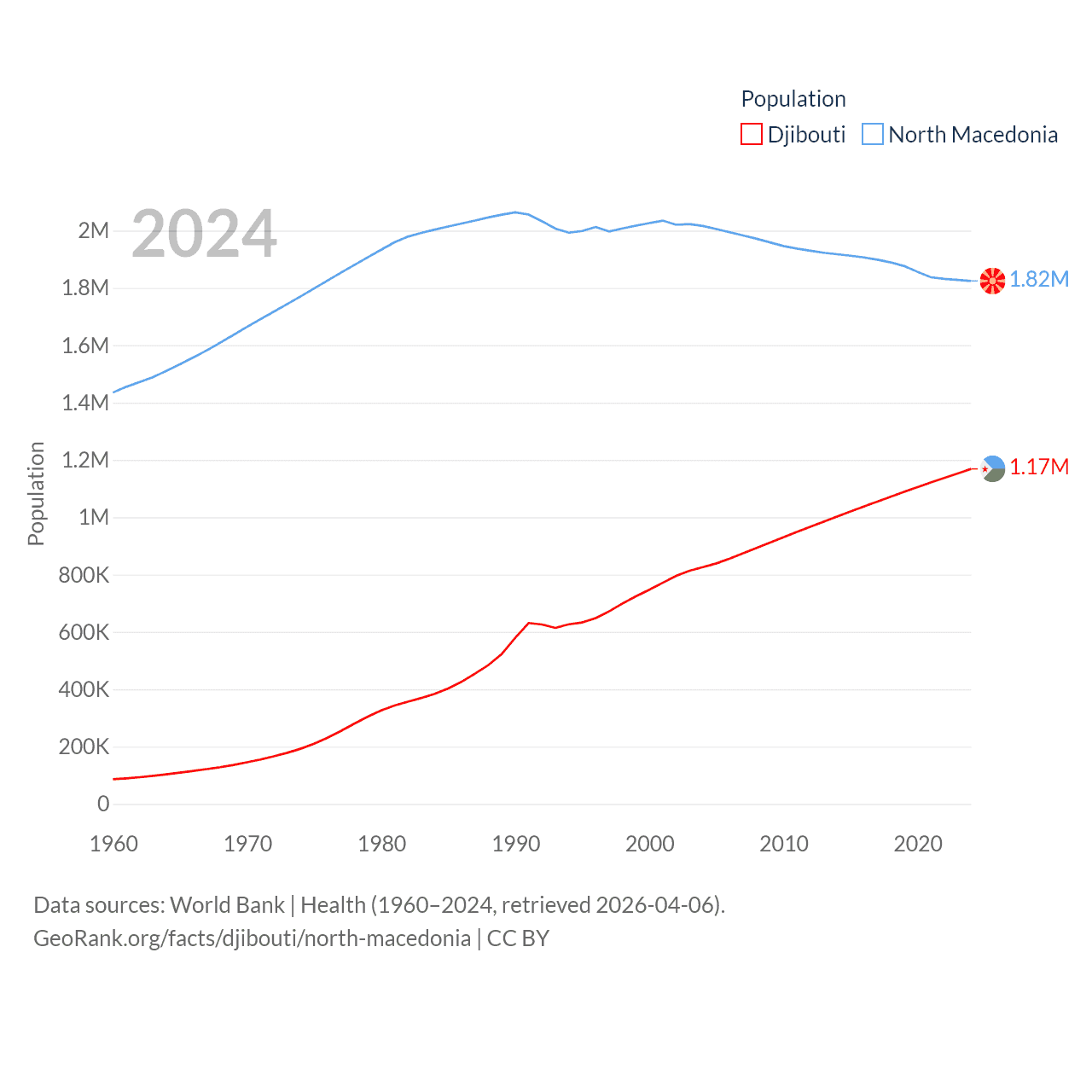 Djibouti has a population of 1.17M (ranked 158/197), compared with 1.82M in North Macedonia (ranked 150/197). Djibouti's land area is 8,950 sq mi versus 9,737 sq mi for North Macedonia (ranked 147th vs. 145th).