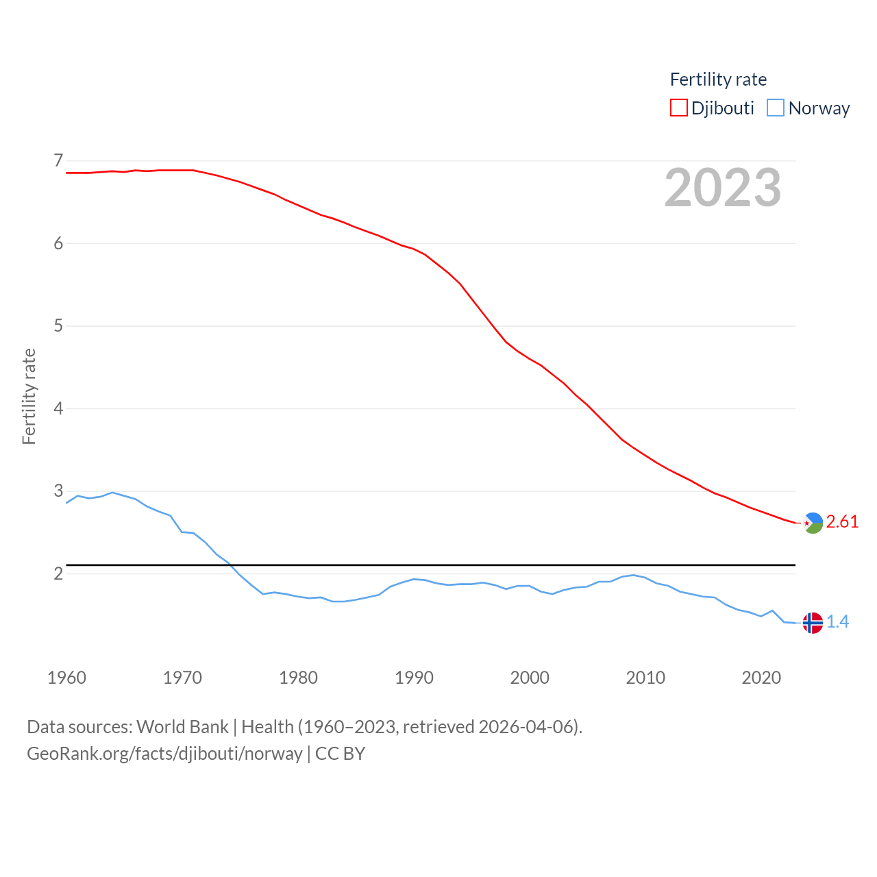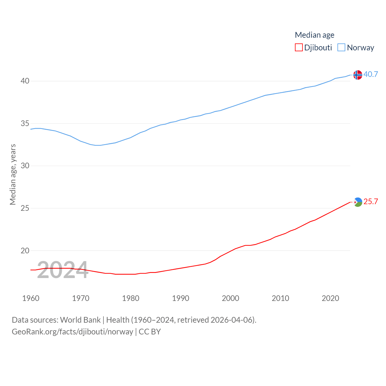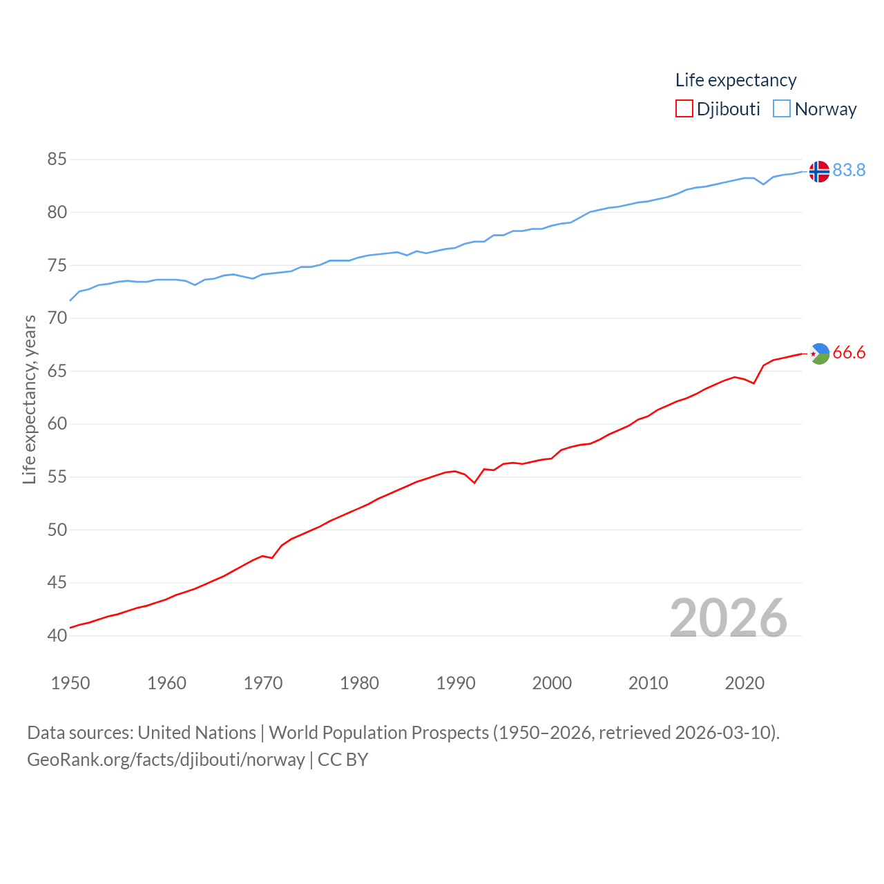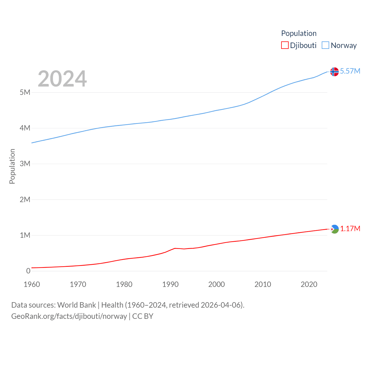 Djibouti has a population of 1.17M (ranked 158/197), compared with 5.57M in Norway (ranked 118/197). Djibouti's land area is 8,950 sq mi versus 140,645 sq mi for Norway (ranked 147th vs. 62nd).