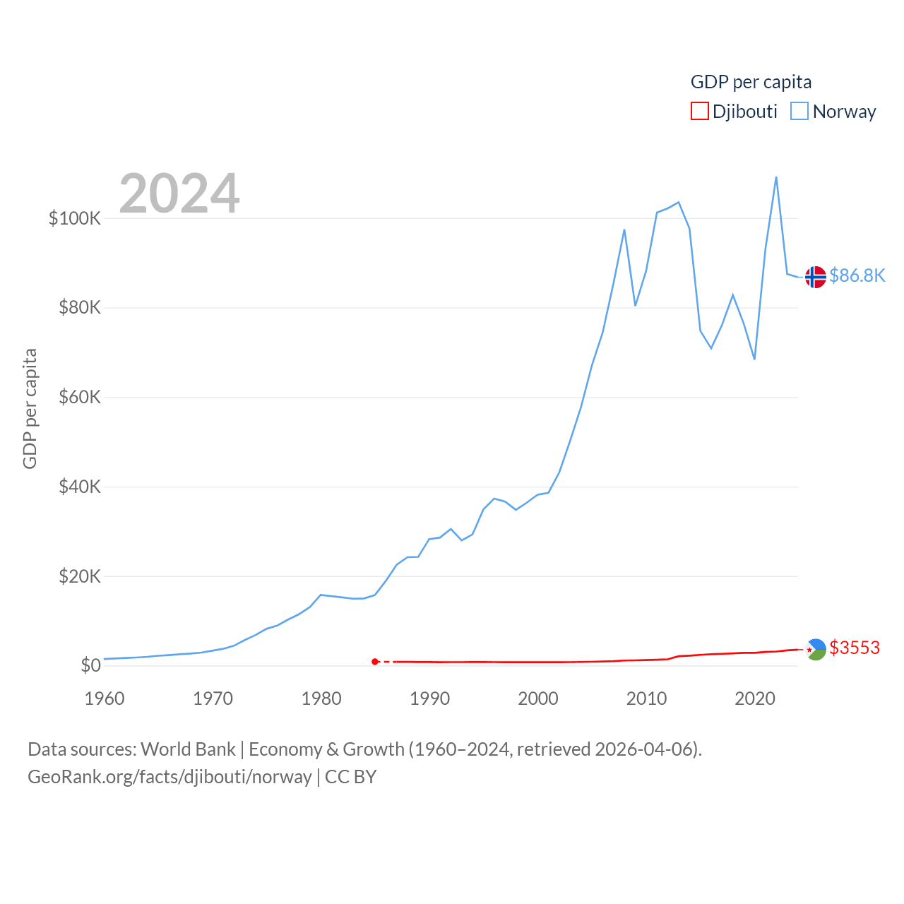 By GDP, Djibouti ranks 165/197 ($4.15B) and Norway ranks 32/197 ($484B). By GDP per capita, Djibouti ranks 133/197 ($3,553), while Norway ranks 8/197 ($86,785).