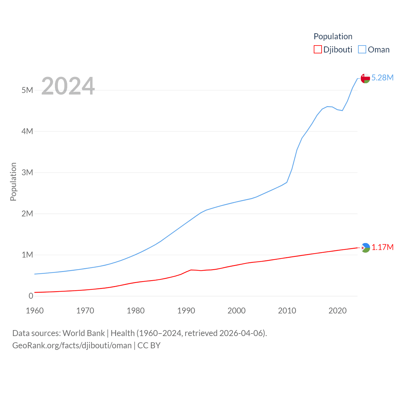 Djibouti has a population of 1.17M (ranked 158/197), compared with 5.28M in Oman (ranked 124/197). Djibouti's land area is 8,950 sq mi versus 119,499 sq mi for Oman (ranked 147th vs. 68th).
