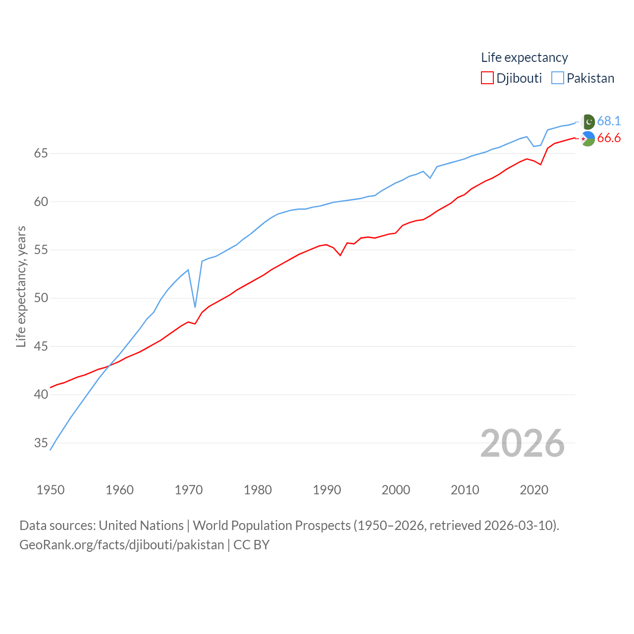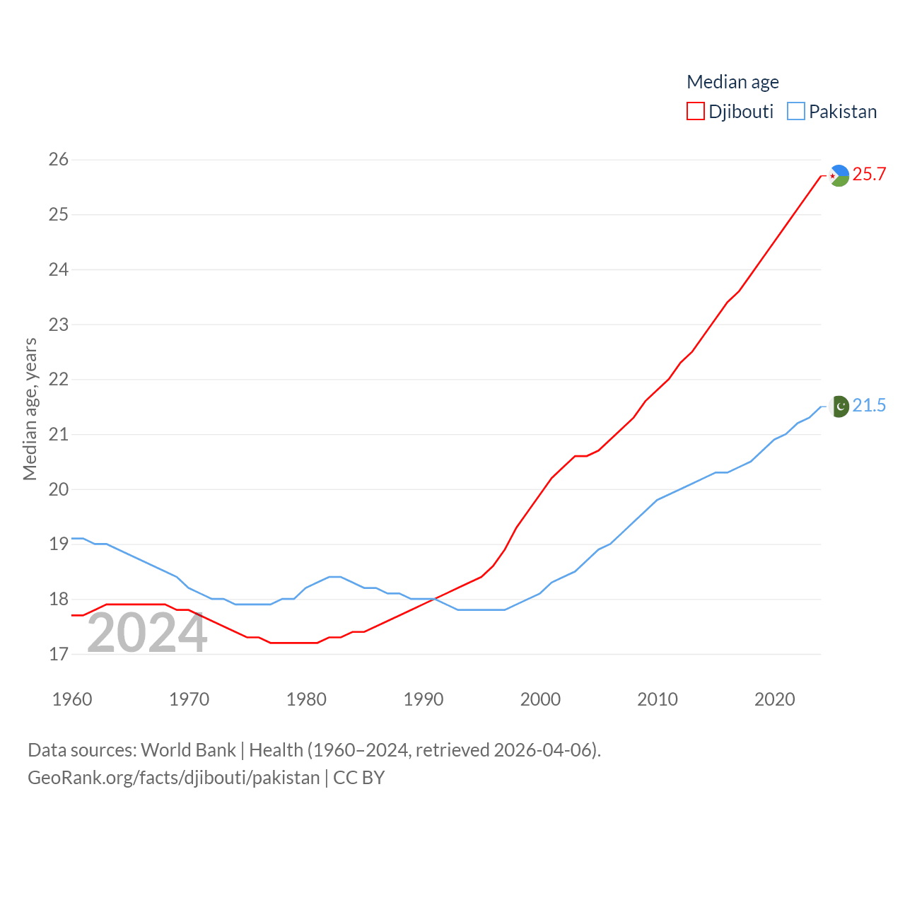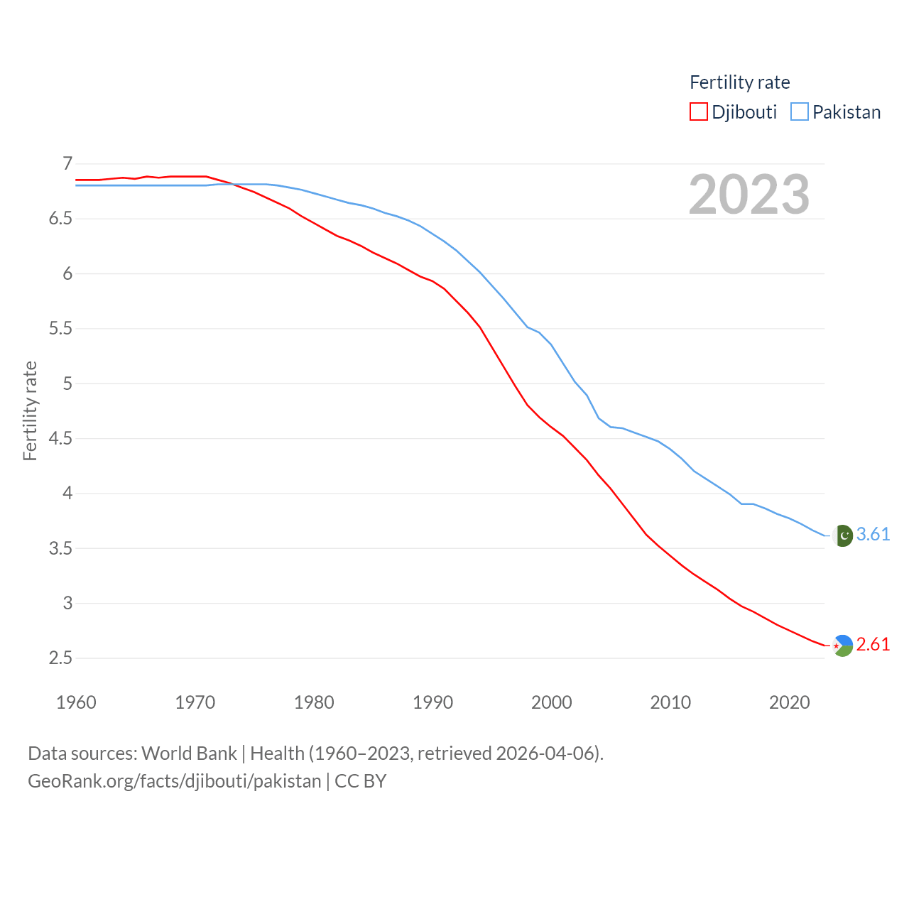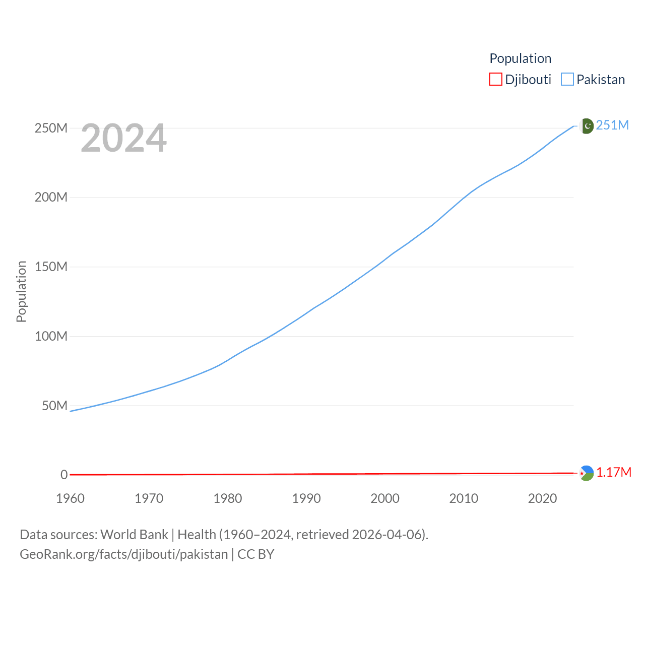Djibouti has a population of 1.17M (ranked 158/197), compared with 251M in Pakistan (ranked 5/197). Djibouti's land area is 8,950 sq mi versus 297,638 sq mi for Pakistan (ranked 147th vs. 35th).