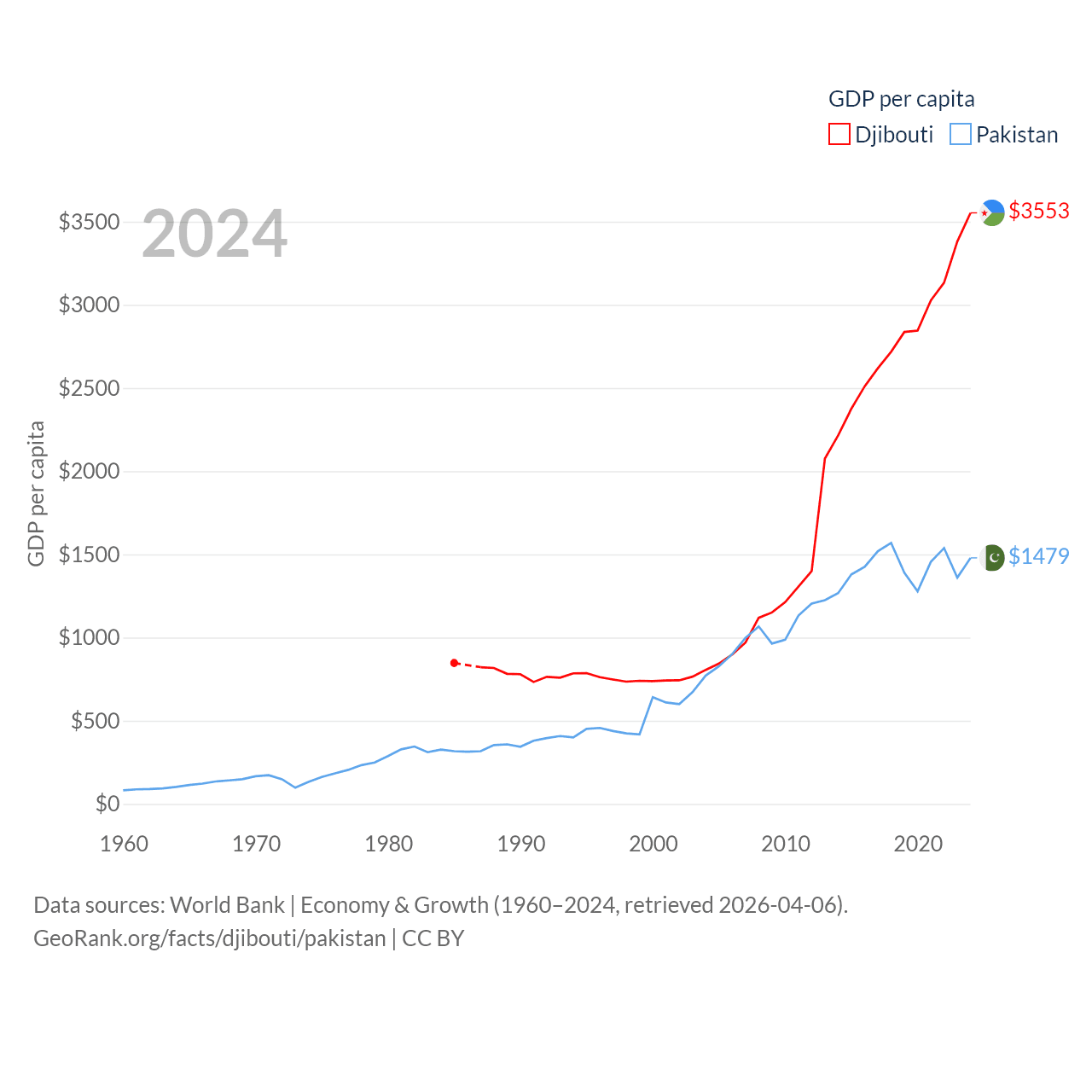 By GDP, Djibouti ranks 165/197 ($4.15B) and Pakistan ranks 43/197 ($372B). By GDP per capita, Djibouti ranks 133/197 ($3,553), while Pakistan ranks 163/197 ($1,479).