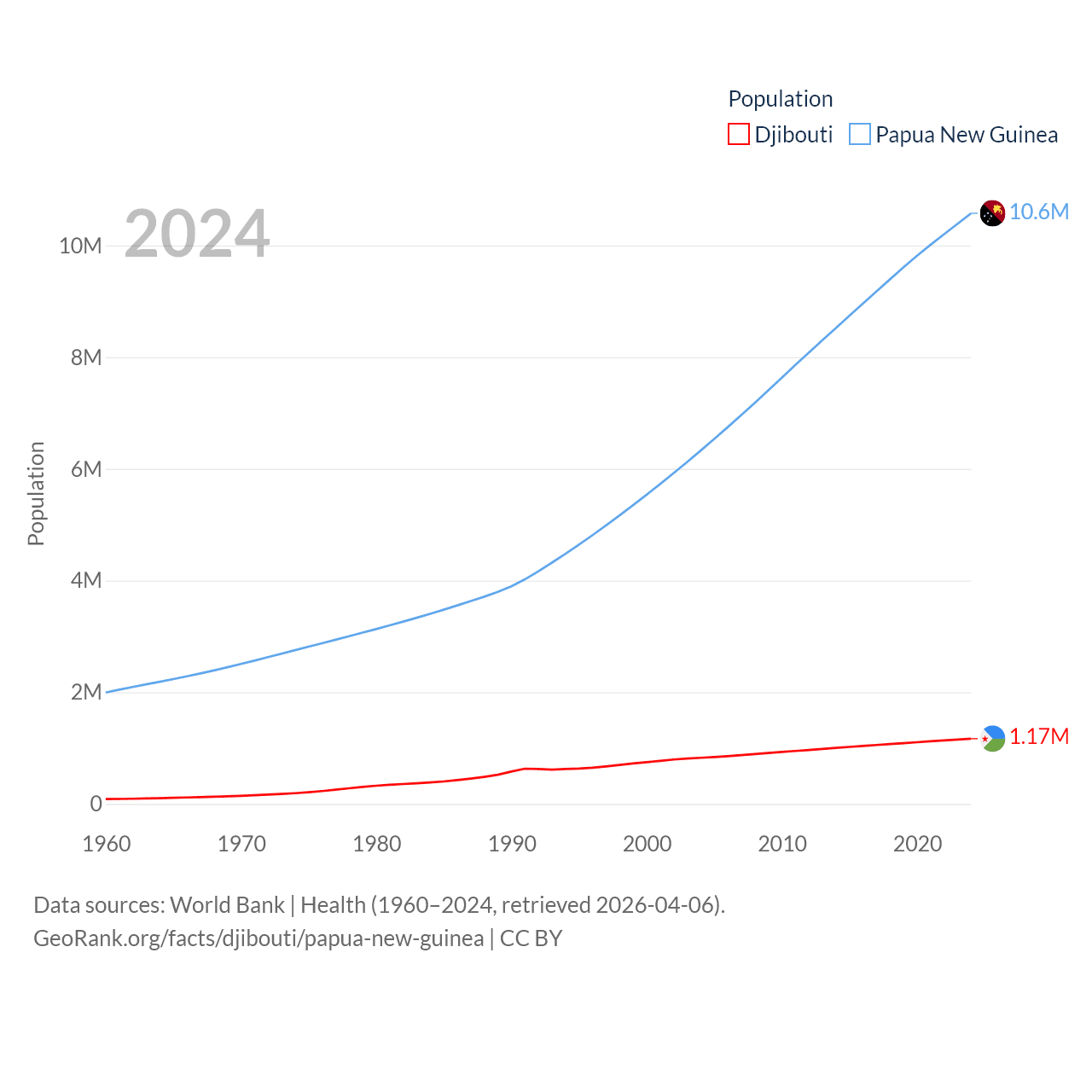 Djibouti has a population of 1.17M (ranked 158/197), compared with 10.6M in Papua New Guinea (ranked 92/197). Djibouti's land area is 8,950 sq mi versus 174,850 sq mi for Papua New Guinea (ranked 147th vs. 54th).