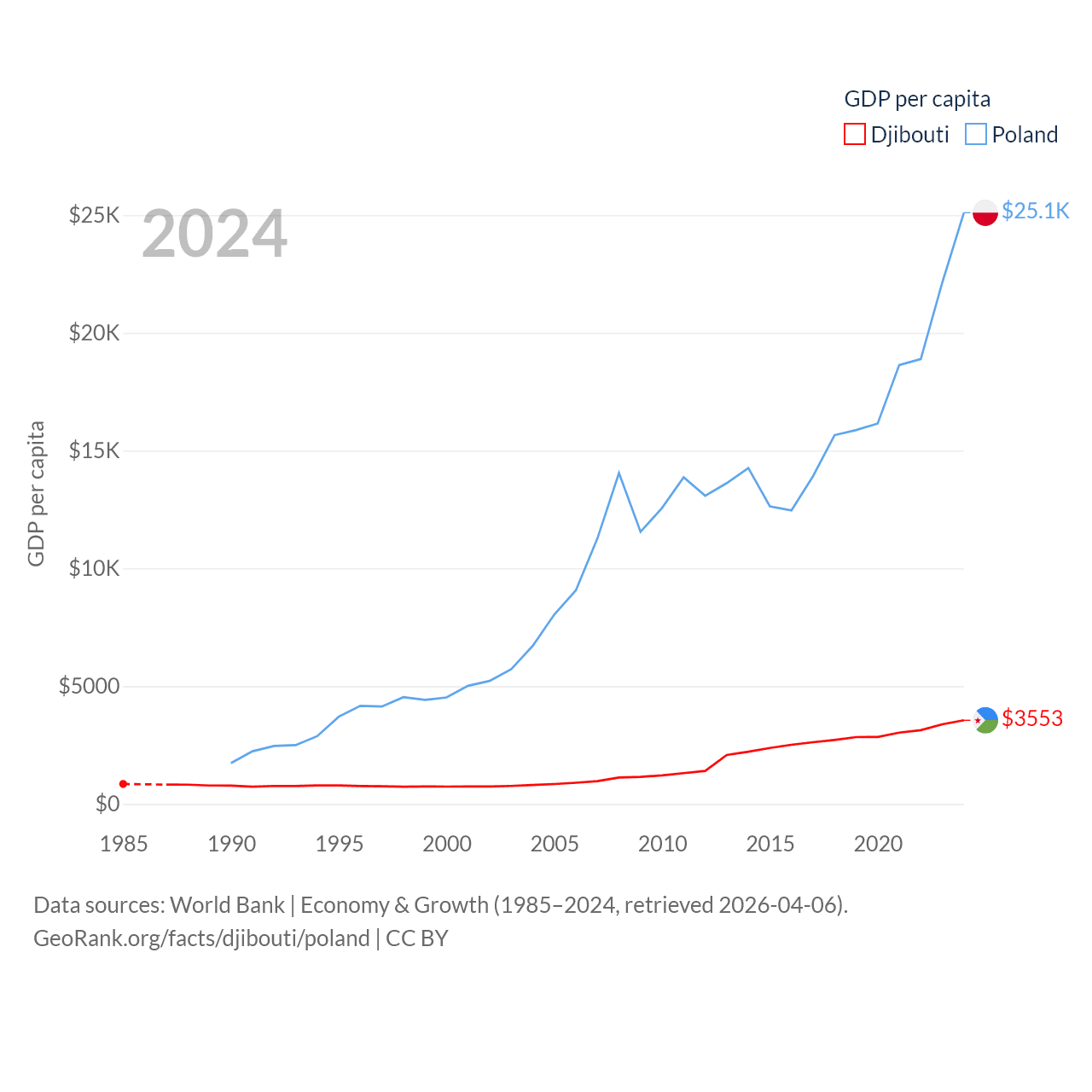 By GDP, Djibouti ranks 165/197 ($4.15B) and Poland ranks 21/197 ($918B). By GDP per capita, Djibouti ranks 133/197 ($3,553), while Poland ranks 48/197 ($25,104).