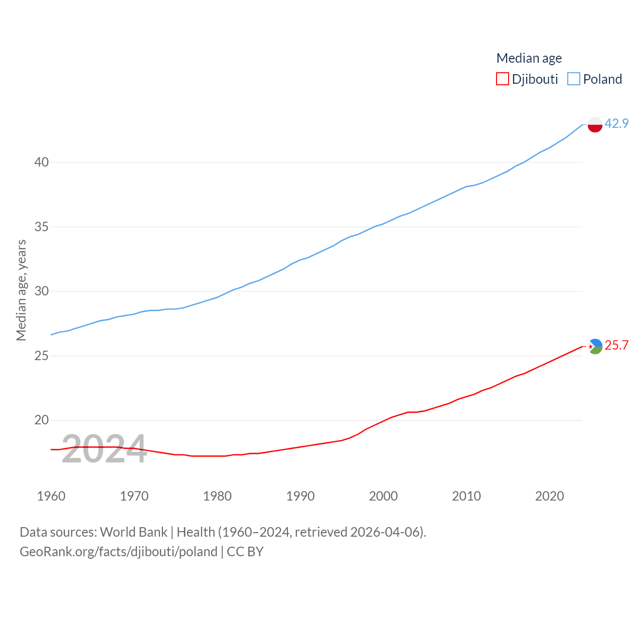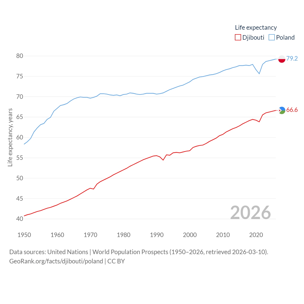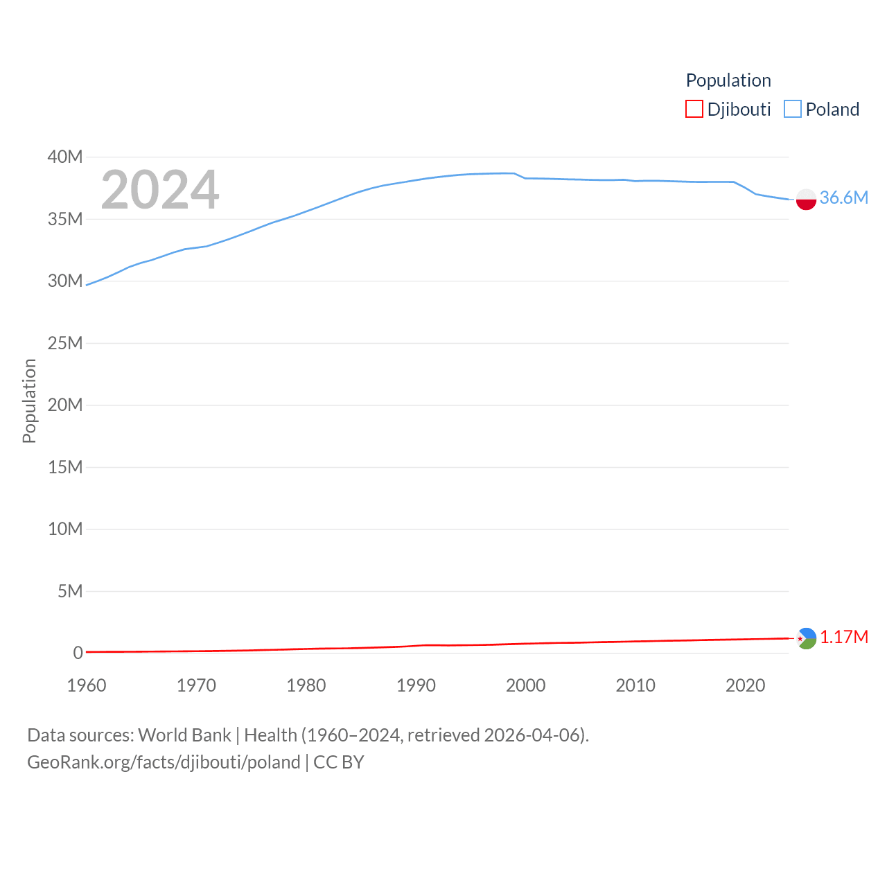 Djibouti has a population of 1.17M (ranked 158/197), compared with 36.6M in Poland (ranked 42/197). Djibouti's land area is 8,950 sq mi versus 118,252 sq mi for Poland (ranked 147th vs. 69th).