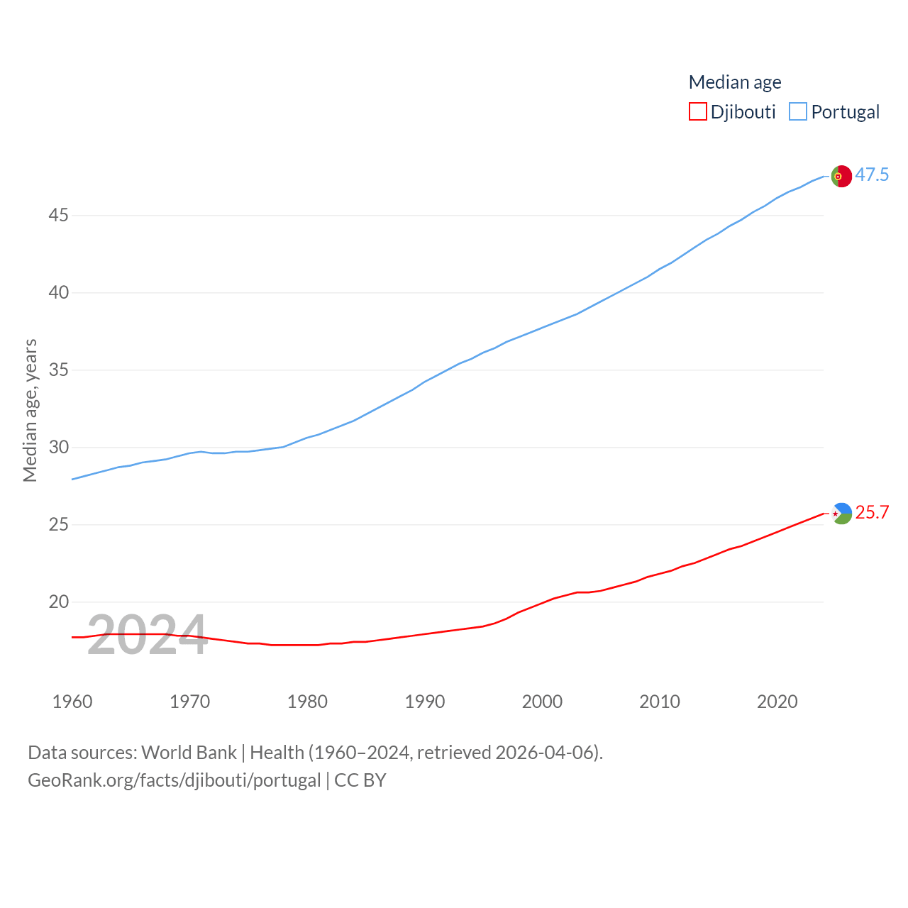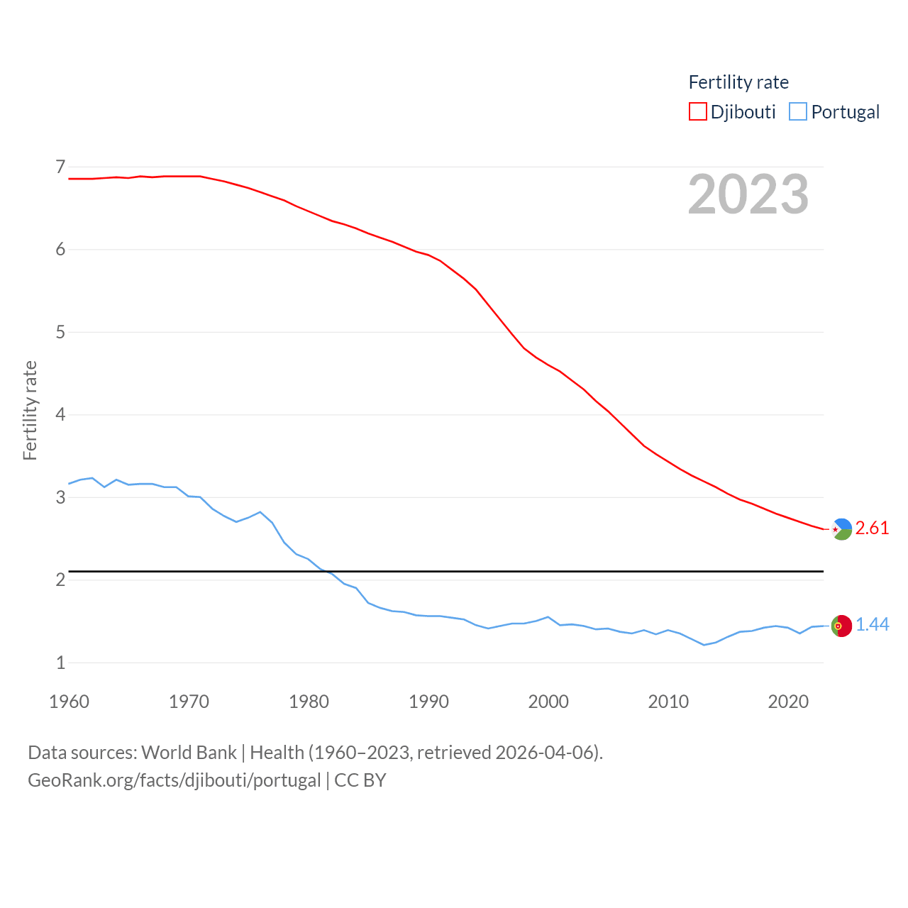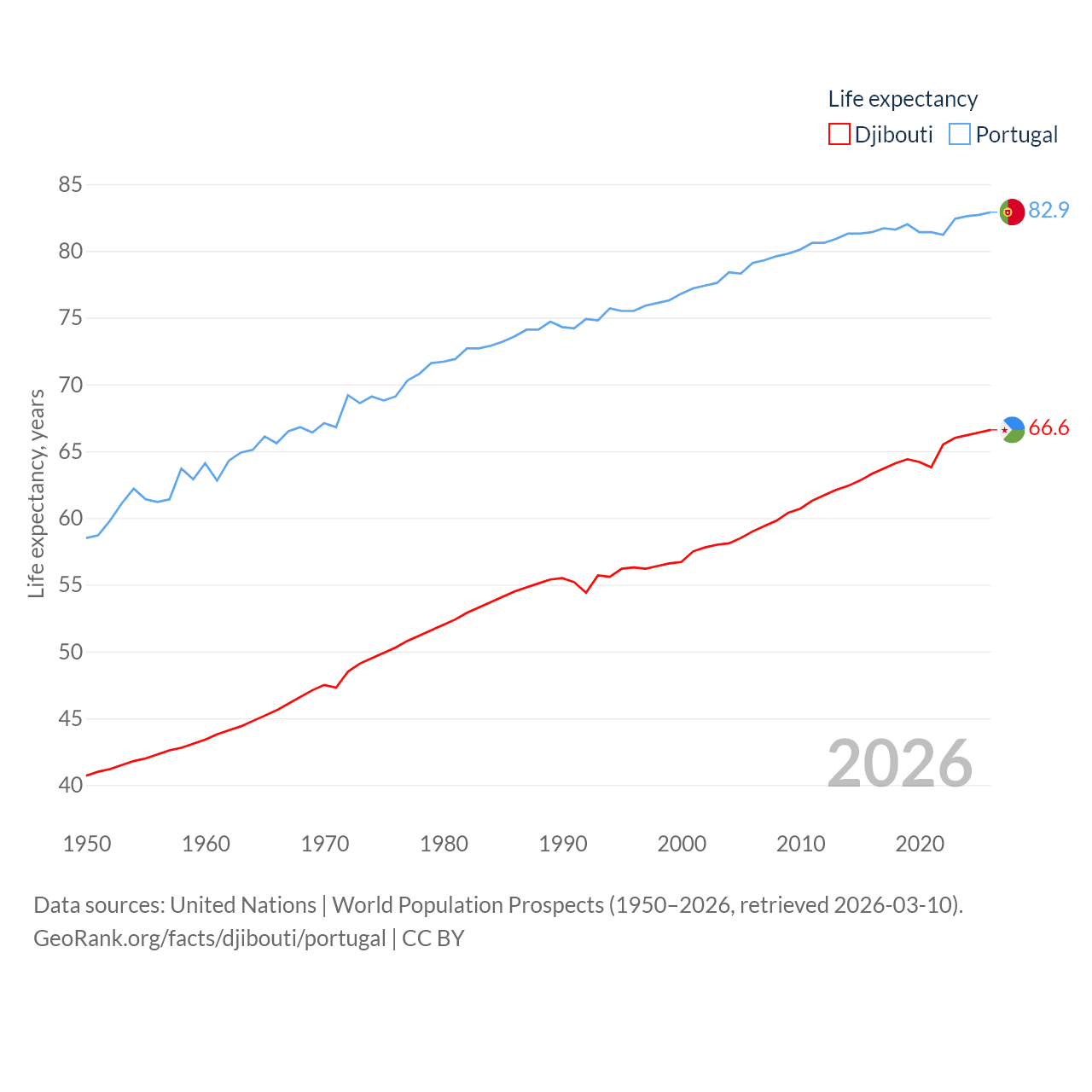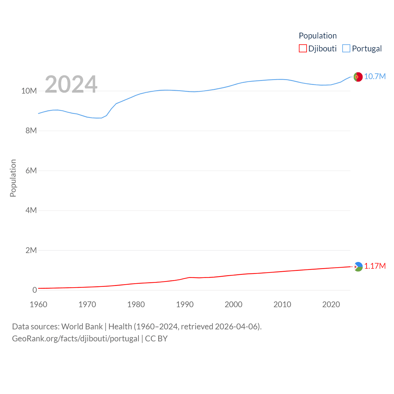Djibouti has a population of 1.17M (ranked 158/197), compared with 10.7M in Portugal (ranked 90/197). Djibouti's land area is 8,950 sq mi versus 35,369 sq mi for Portugal (ranked 147th vs. 108th).
