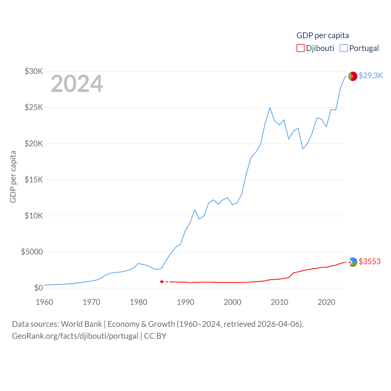 By GDP, Djibouti ranks 165/197 ($4.15B) and Portugal ranks 46/197 ($313B). By GDP per capita, Djibouti ranks 133/197 ($3,553), while Portugal ranks 44/197 ($29,292).