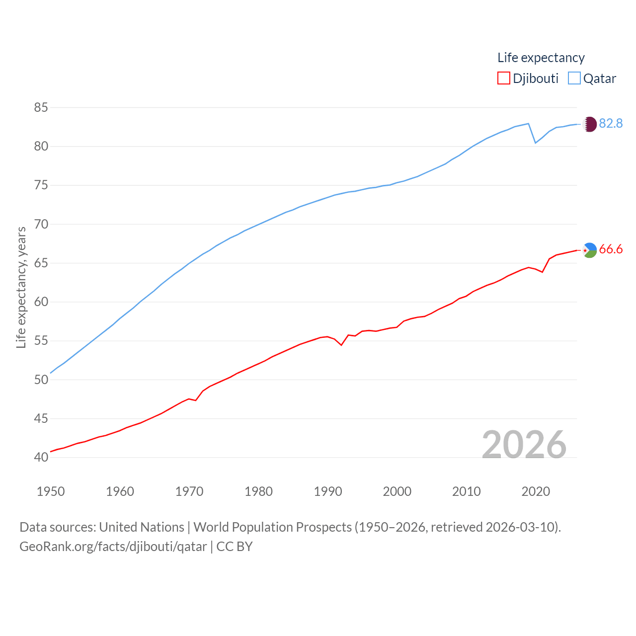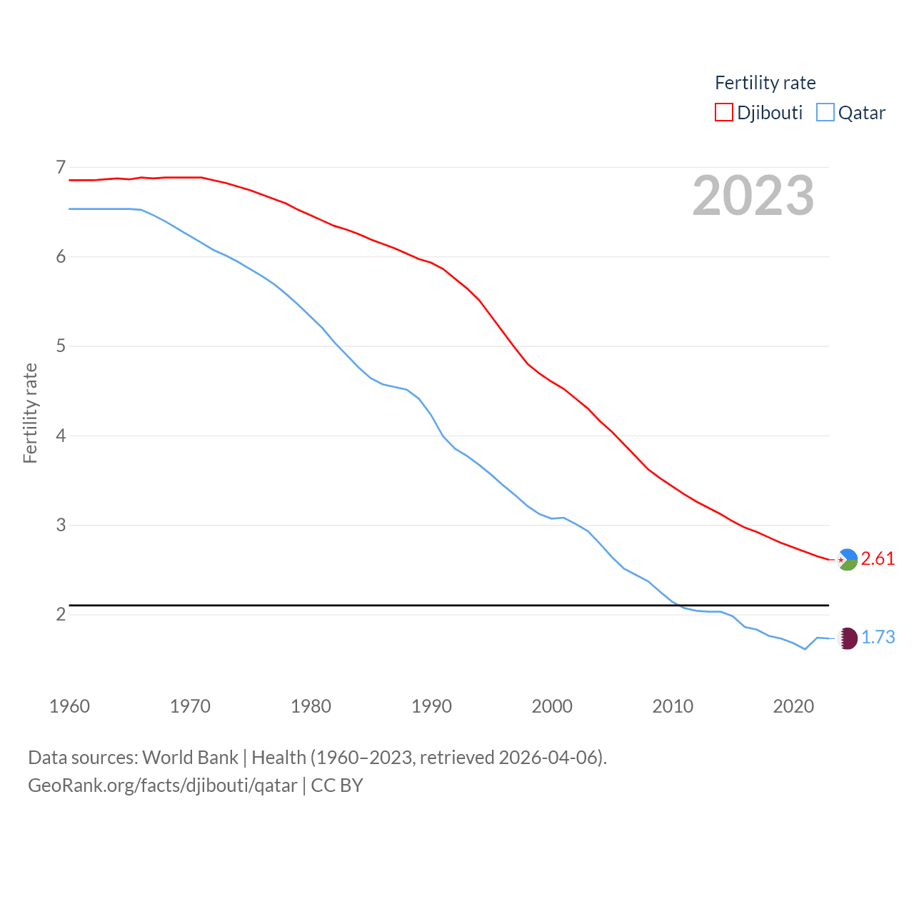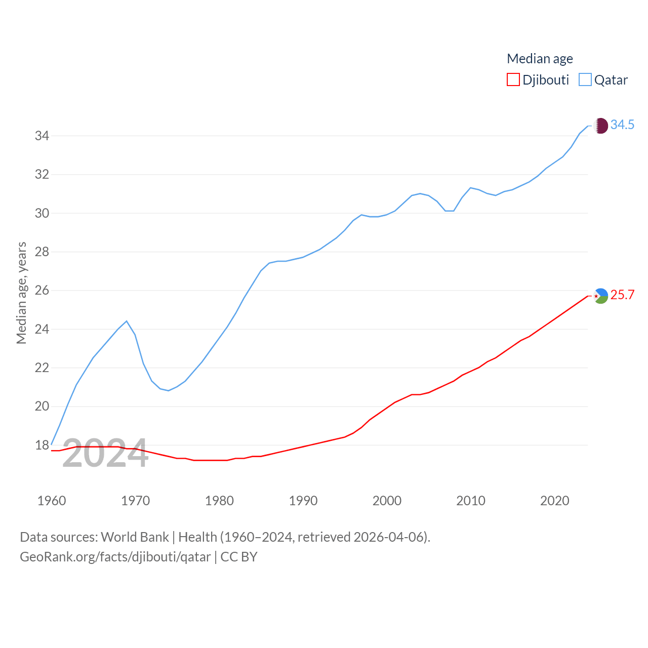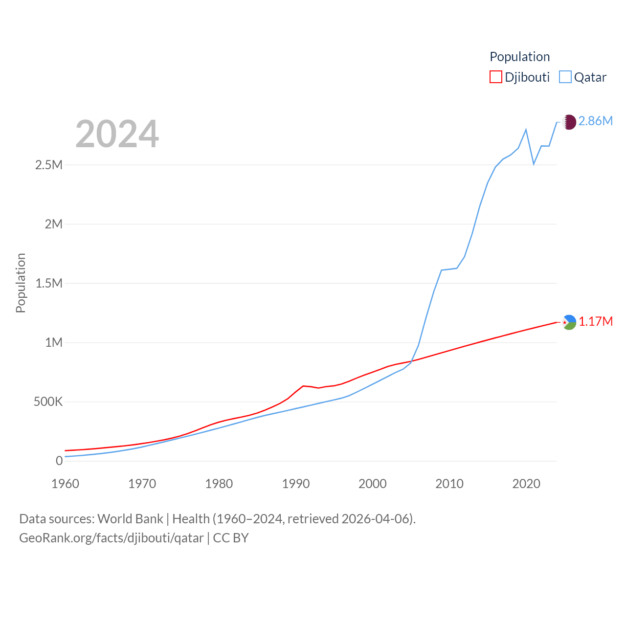 Djibouti has a population of 1.17M (ranked 158/197), compared with 2.86M in Qatar (ranked 138/197). Djibouti's land area is 8,950 sq mi versus 4,436 sq mi for Qatar (ranked 147th vs. 158th).
