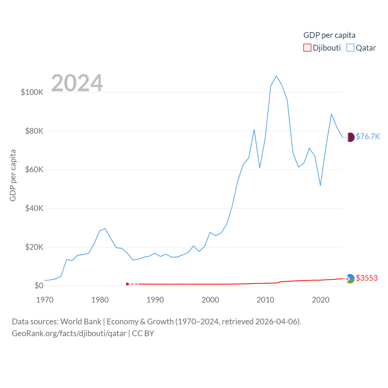 By GDP, Djibouti ranks 165/197 ($4.15B) and Qatar ranks 56/197 ($219B). By GDP per capita, Djibouti ranks 133/197 ($3,553), while Qatar ranks 11/197 ($76,689).