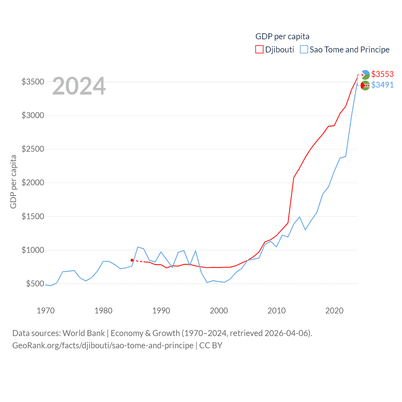 By GDP, Djibouti ranks 165/197 ($4.15B) and Sao Tome and Principe ranks 189/197 ($822M). By GDP per capita, Djibouti ranks 133/197 ($3,553), while Sao Tome and Principe ranks 134/197 ($3,491).