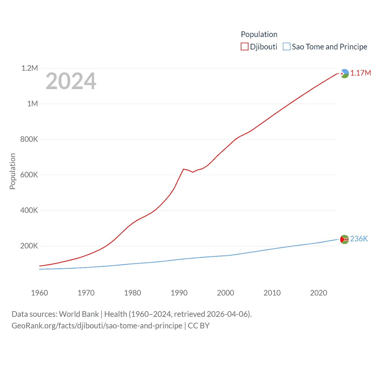 Djibouti has a population of 1.17M (ranked 158/197), compared with 236K in Sao Tome and Principe (ranked 176/197). Djibouti's land area is 8,950 sq mi versus 371 sq mi for Sao Tome and Principe (ranked 147th vs. 172nd).