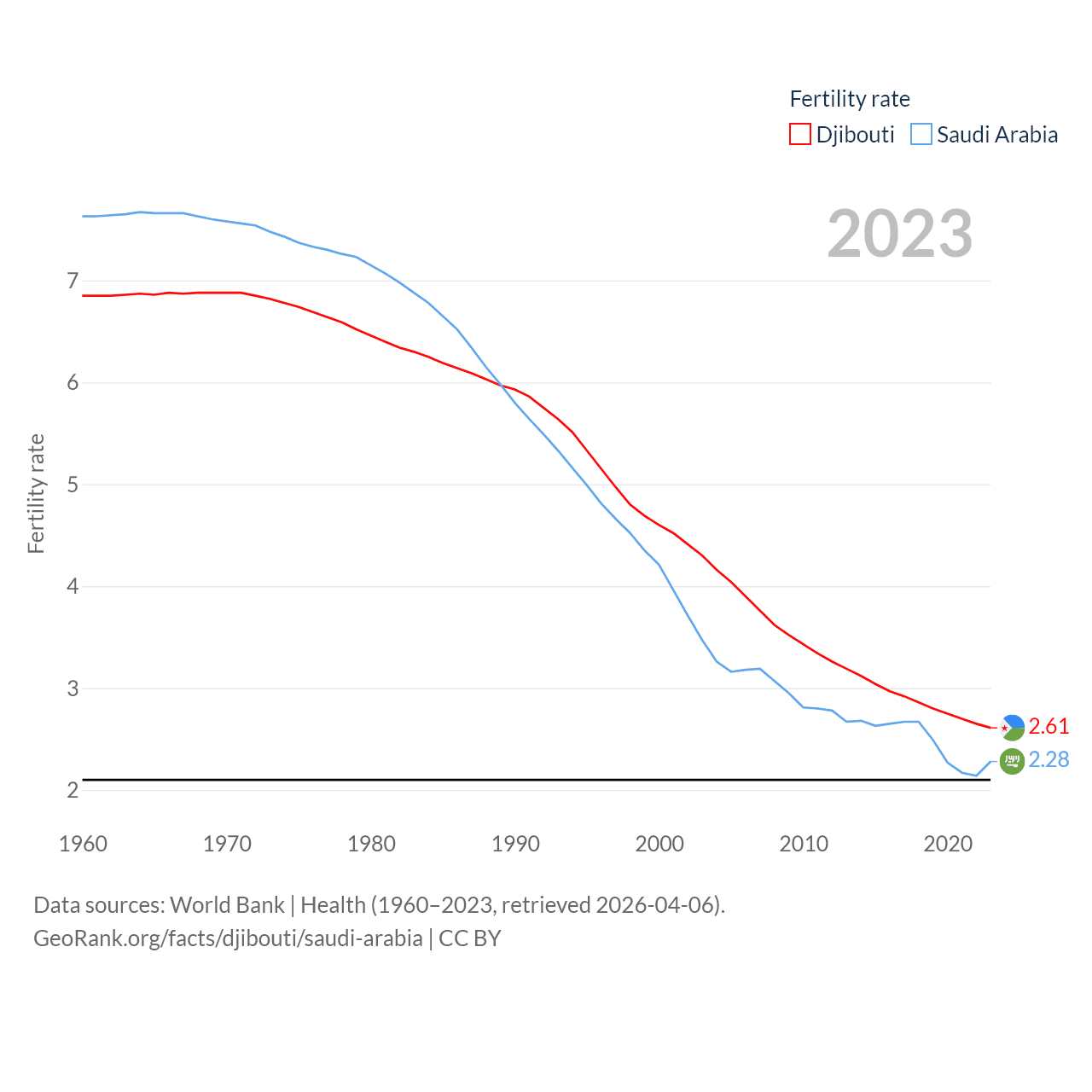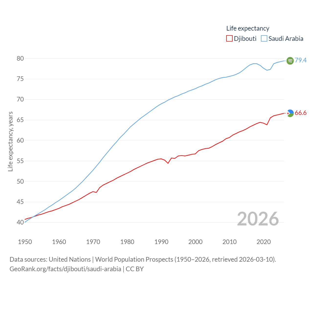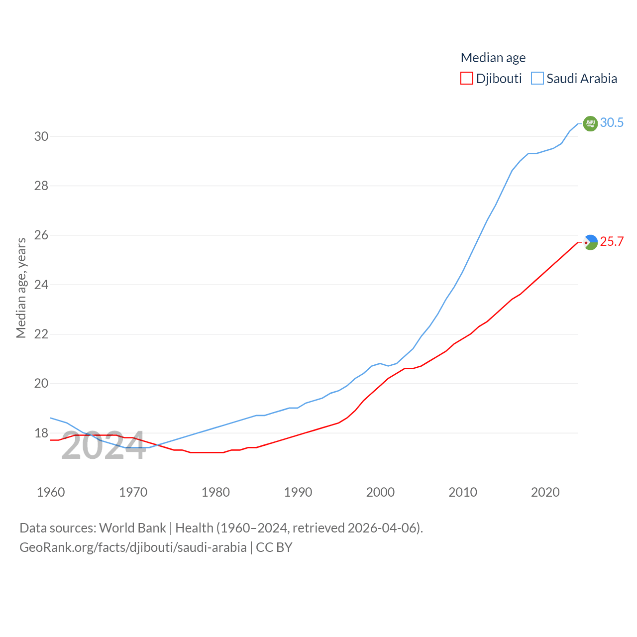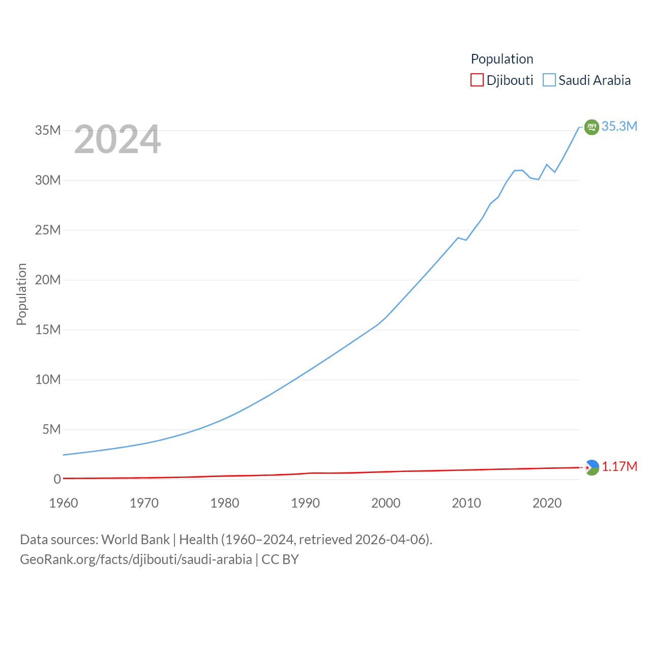 Djibouti has a population of 1.17M (ranked 158/197), compared with 35.3M in Saudi Arabia (ranked 45/197). Djibouti's land area is 8,950 sq mi versus 830,000 sq mi for Saudi Arabia (ranked 147th vs. 12th).