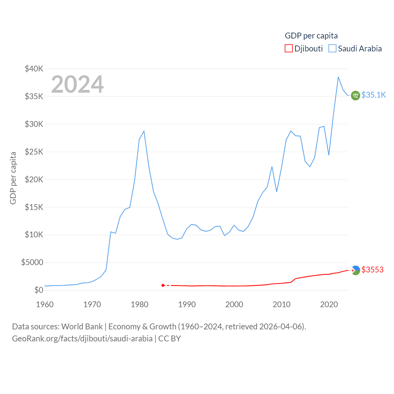 By GDP, Djibouti ranks 165/197 ($4.15B) and Saudi Arabia ranks 18/197 ($1.24T). By GDP per capita, Djibouti ranks 133/197 ($3,553), while Saudi Arabia ranks 33/197 ($35,122).