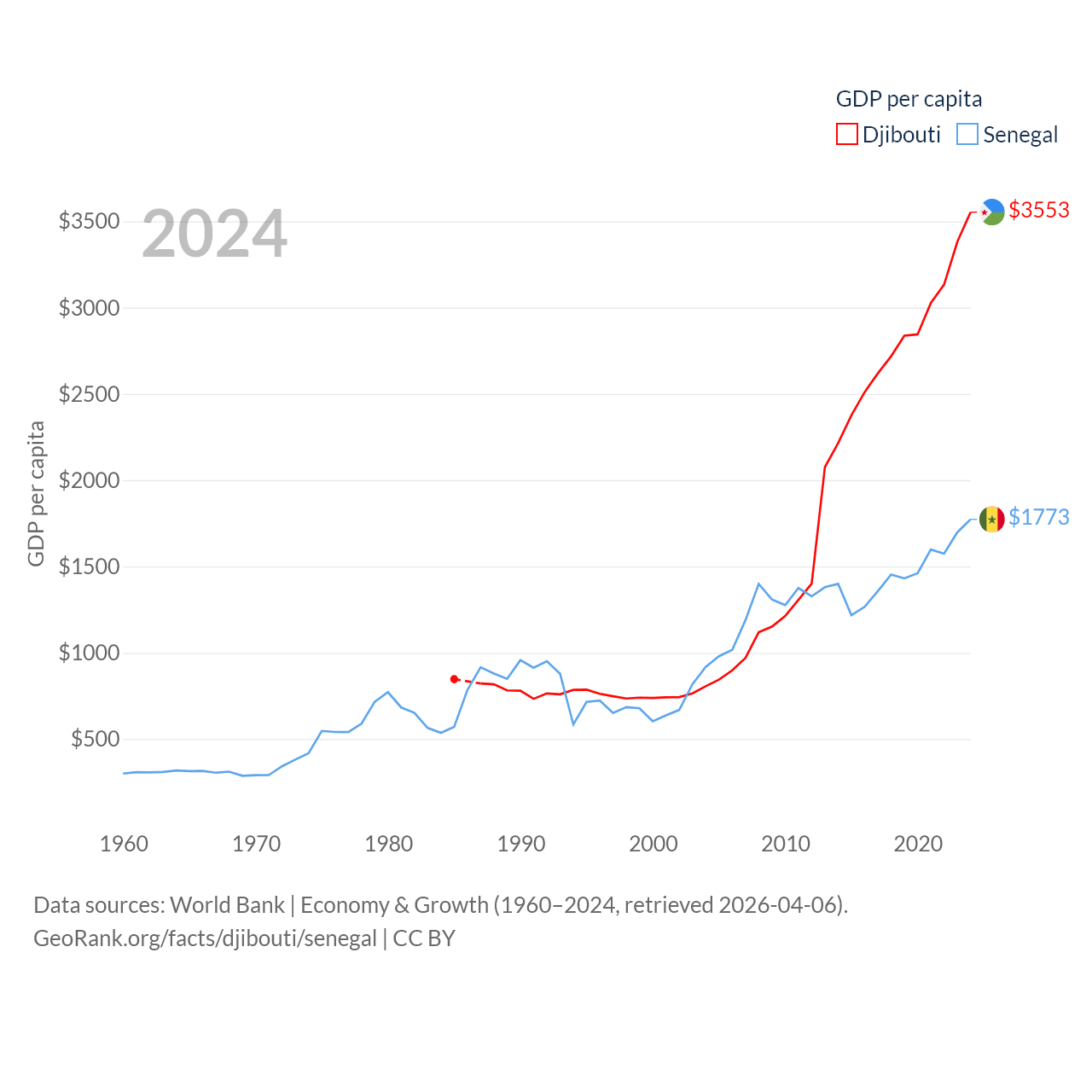 By GDP, Djibouti ranks 165/197 ($4.15B) and Senegal ranks 109/197 ($32.8B). By GDP per capita, Djibouti ranks 133/197 ($3,553), while Senegal ranks 159/197 ($1,773).