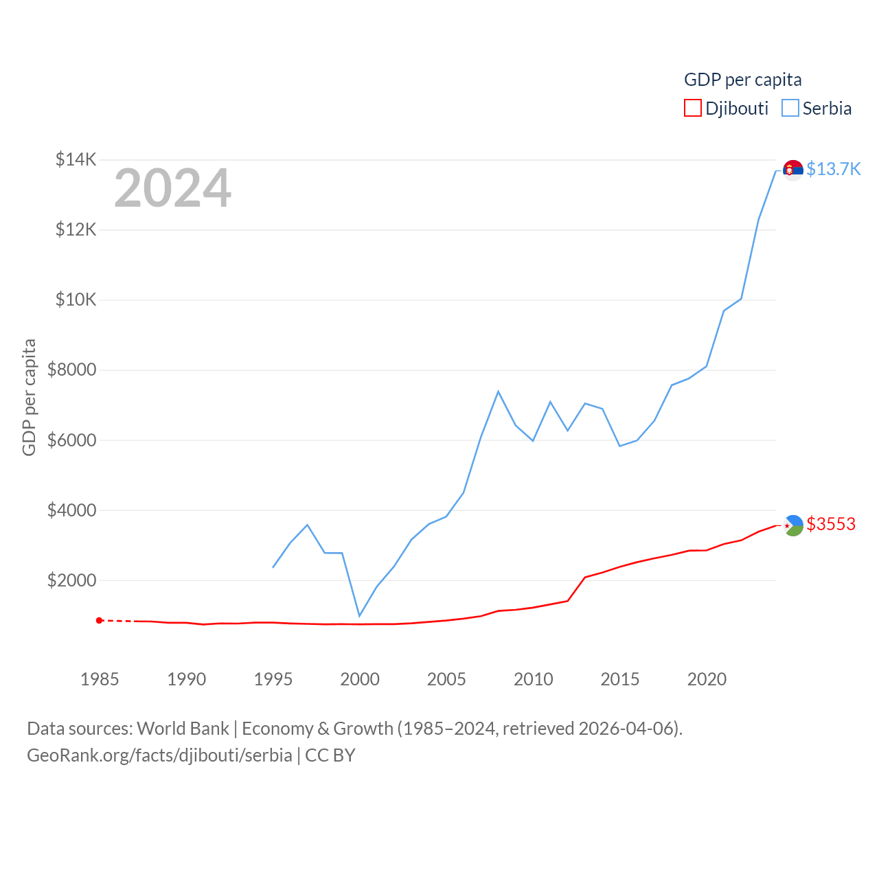 By GDP, Djibouti ranks 165/197 ($4.15B) and Serbia ranks 76/197 ($90.1B). By GDP per capita, Djibouti ranks 133/197 ($3,553), while Serbia ranks 73/197 ($13,679).