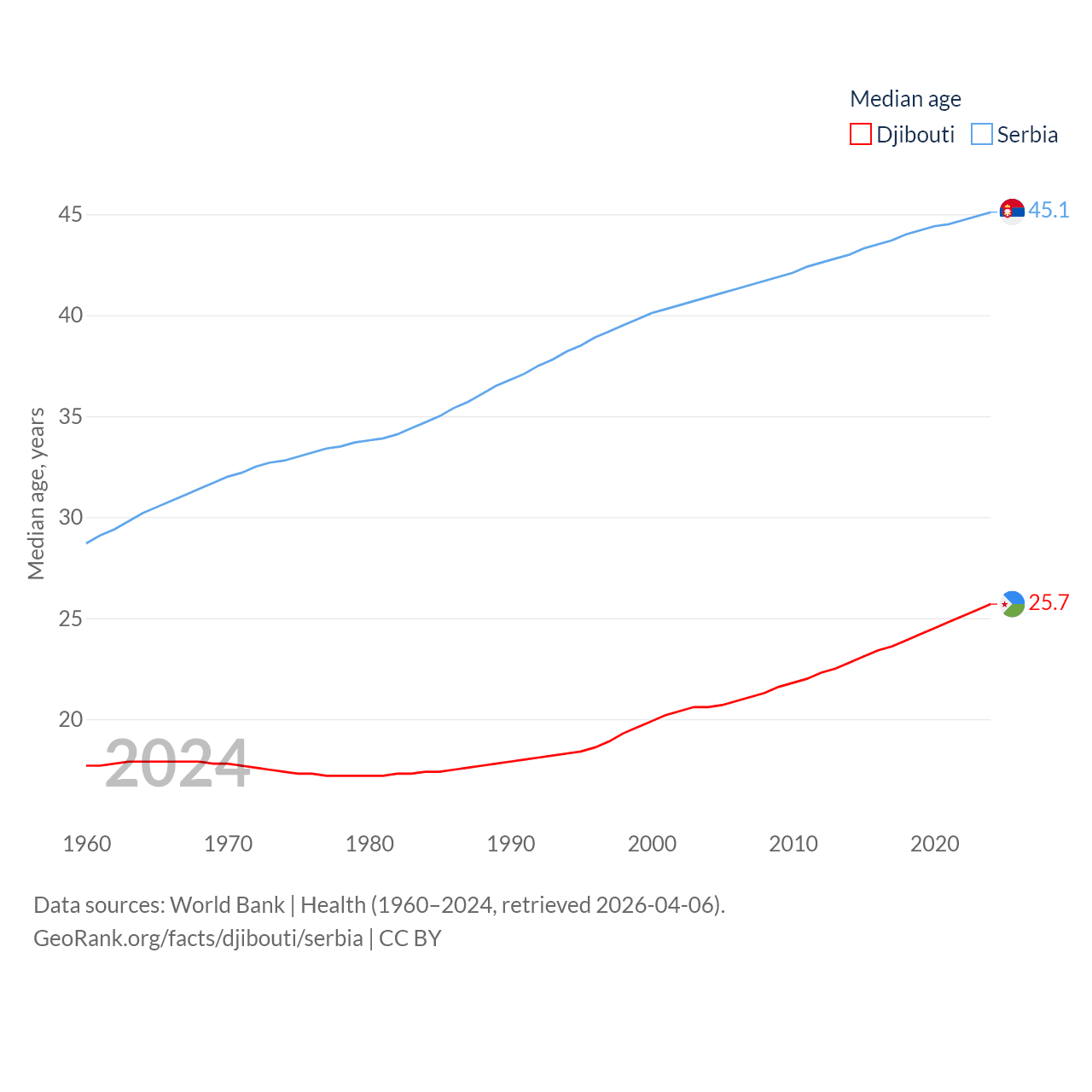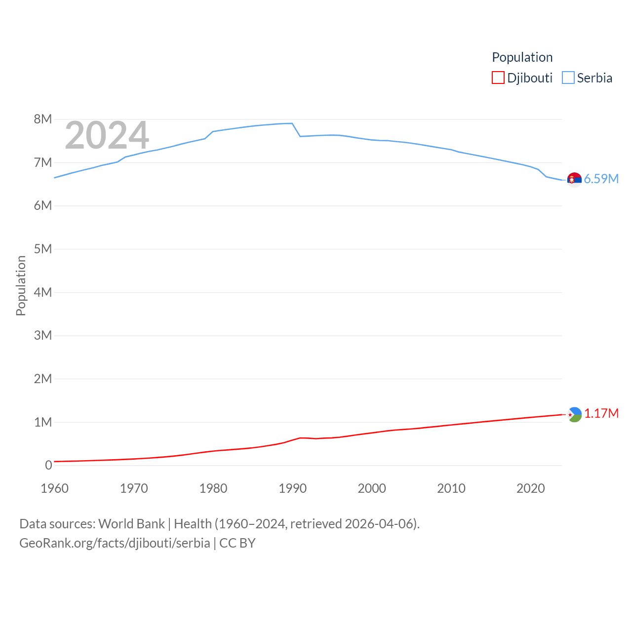 Djibouti has a population of 1.17M (ranked 158/197), compared with 6.59M in Serbia (ranked 109/197). Djibouti's land area is 8,950 sq mi versus 32,467 sq mi for Serbia (ranked 147th vs. 111th).