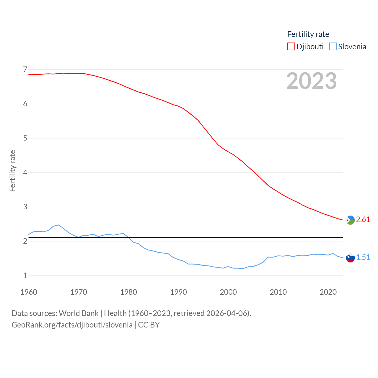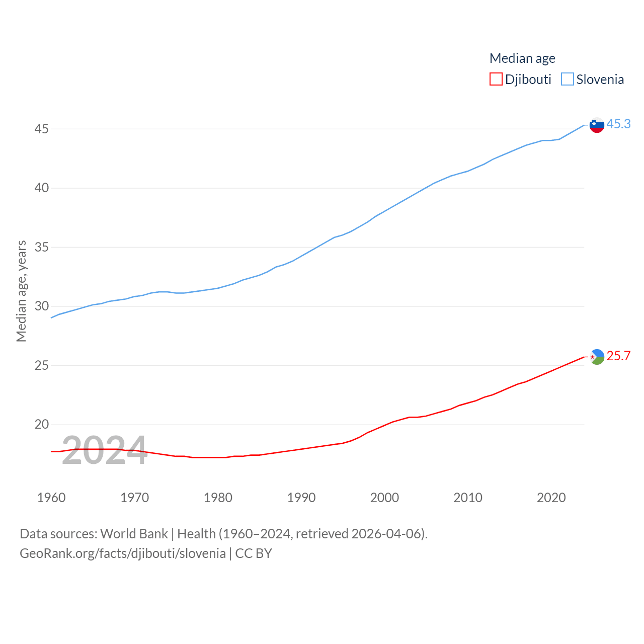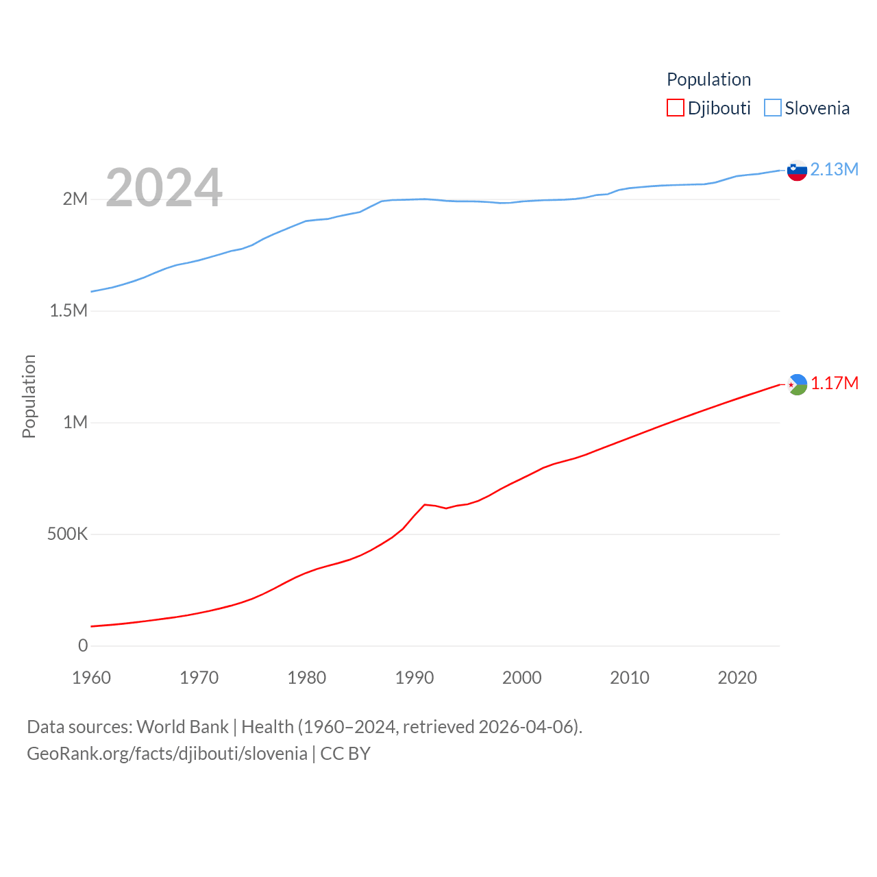 Djibouti has a population of 1.17M (ranked 158/197), compared with 2.13M in Slovenia (ranked 147/197). Djibouti's land area is 8,950 sq mi versus 7,774 sq mi for Slovenia (ranked 147th vs. 151st).