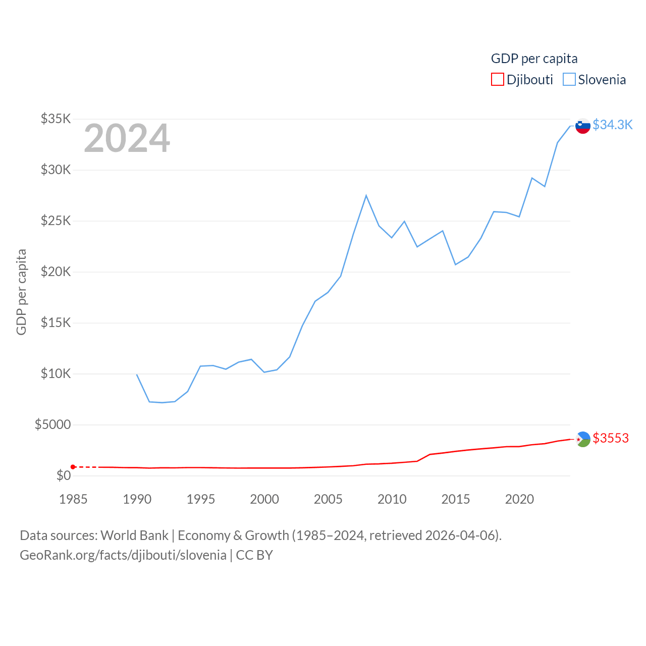 By GDP, Djibouti ranks 165/197 ($4.15B) and Slovenia ranks 86/197 ($73B). By GDP per capita, Djibouti ranks 133/197 ($3,553), while Slovenia ranks 34/197 ($34,301).