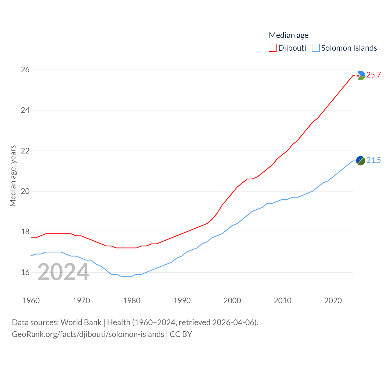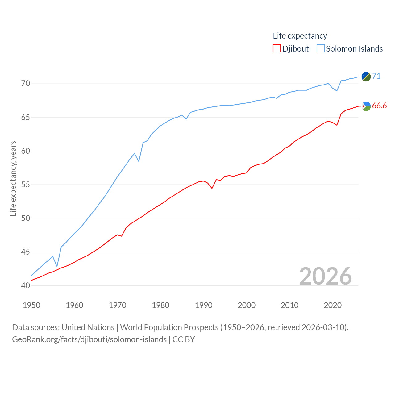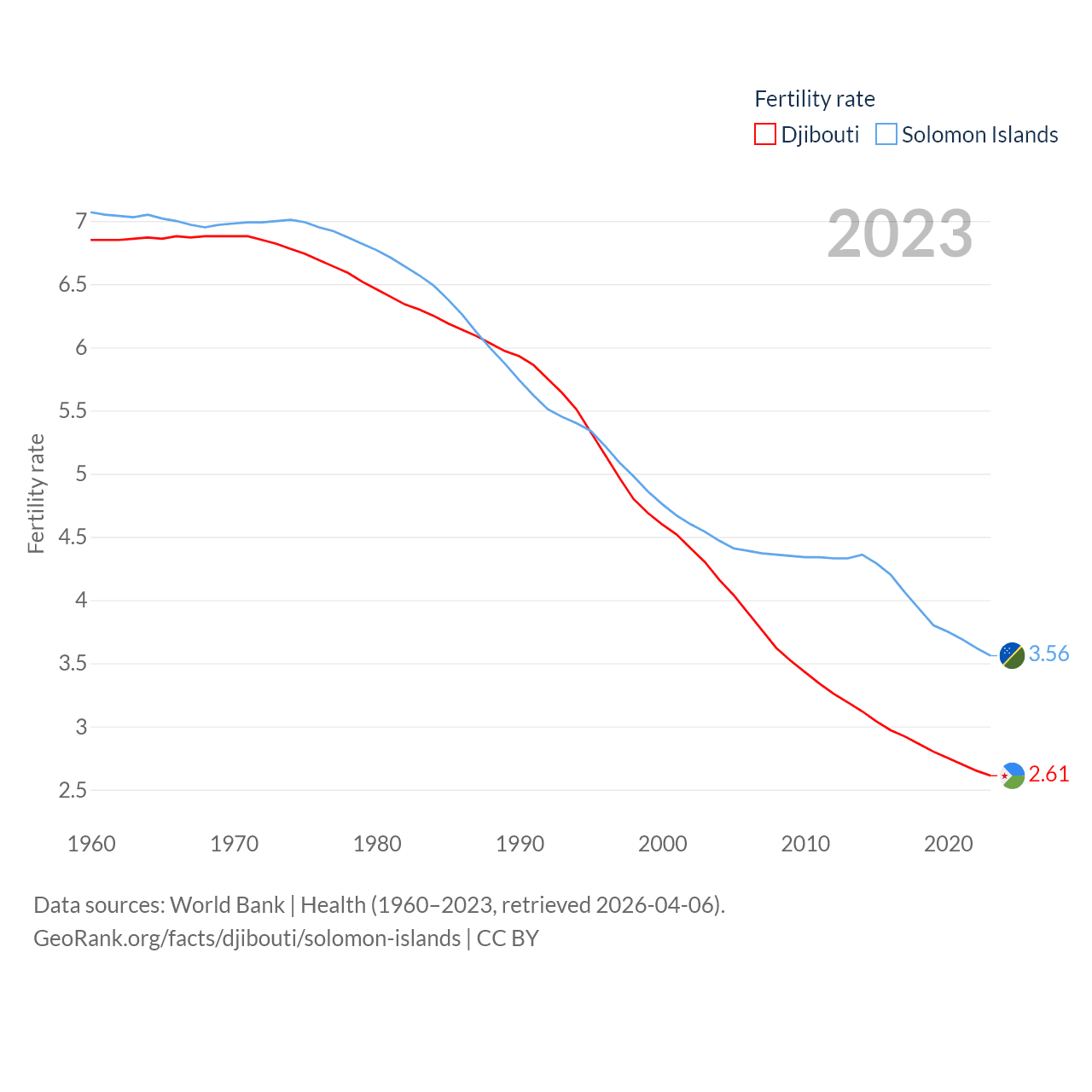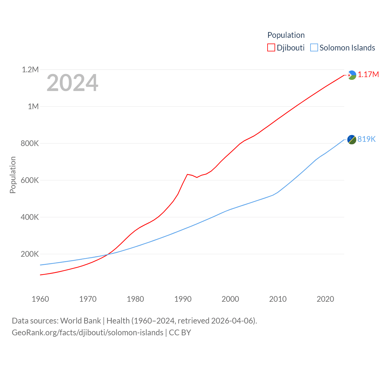 Djibouti has a population of 1.17M (ranked 158/197), compared with 819K in The Solomon Islands (ranked 162/197). Djibouti's land area is 8,950 sq mi versus 10,807 sq mi for The Solomon Islands (ranked 147th vs. 141st).