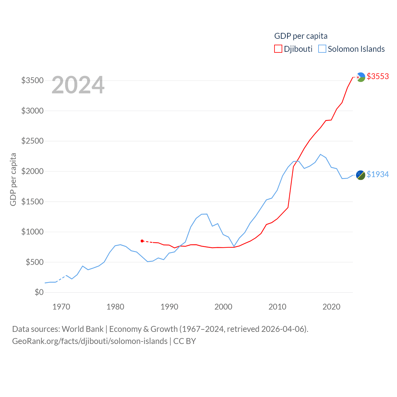By GDP, Djibouti ranks 165/197 ($4.15B) and The Solomon Islands ranks 182/197 ($1.58B). By GDP per capita, Djibouti ranks 133/197 ($3,553), while The Solomon Islands ranks 157/197 ($1,934).