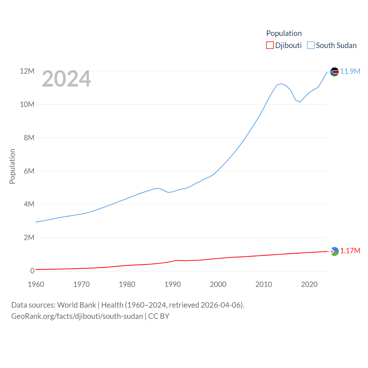 Djibouti has a population of 1.17M (ranked 158/197), compared with 11.9M in South Sudan (ranked 81/197). Djibouti's land area is 8,950 sq mi versus 243,990 sq mi for South Sudan (ranked 147th vs. 41st).
