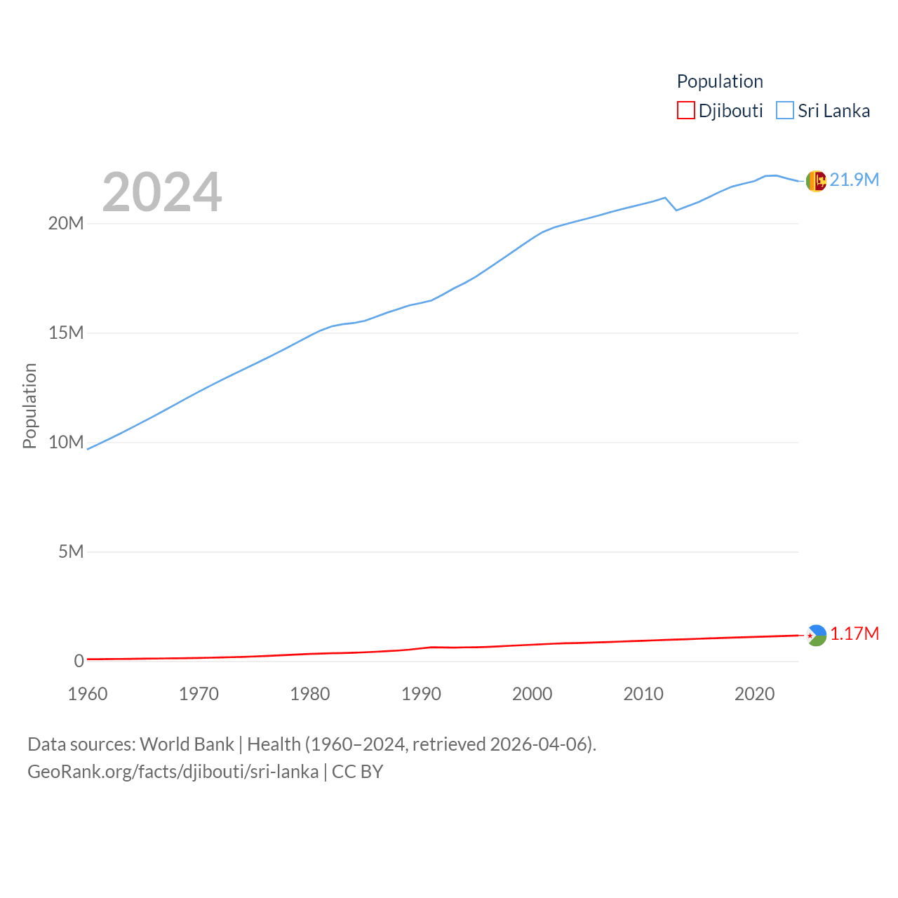 Djibouti has a population of 1.17M (ranked 158/197), compared with 21.9M in Sri Lanka (ranked 61/197). Djibouti's land area is 8,950 sq mi versus 23,884 sq mi for Sri Lanka (ranked 147th vs. 122nd).