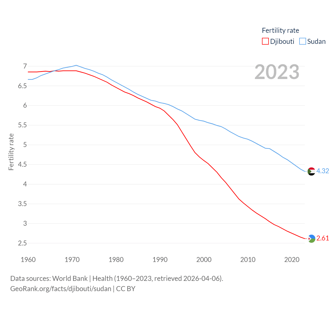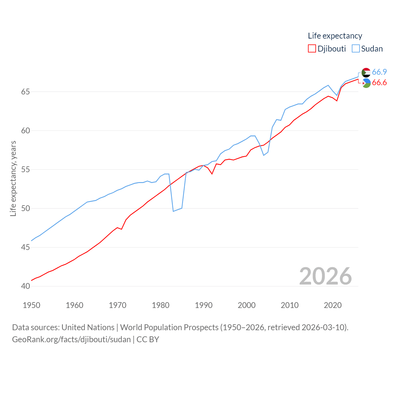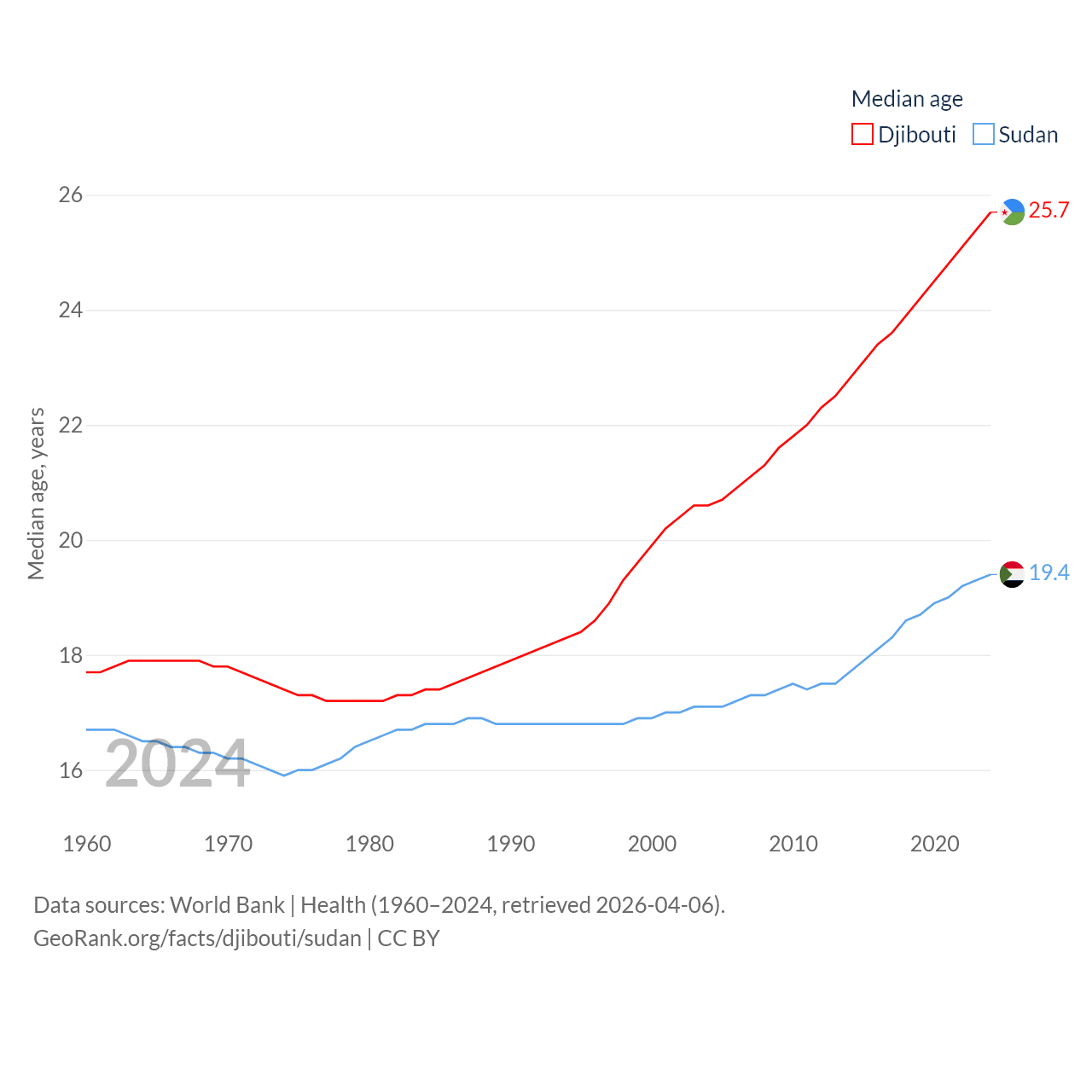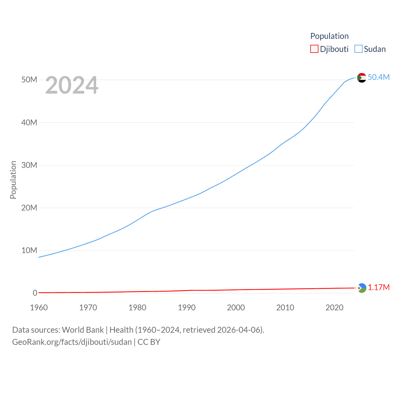 Djibouti has a population of 1.17M (ranked 158/197), compared with 50.4M in Sudan (ranked 30/197). Djibouti's land area is 8,950 sq mi versus 721,239 sq mi for Sudan (ranked 147th vs. 15th).