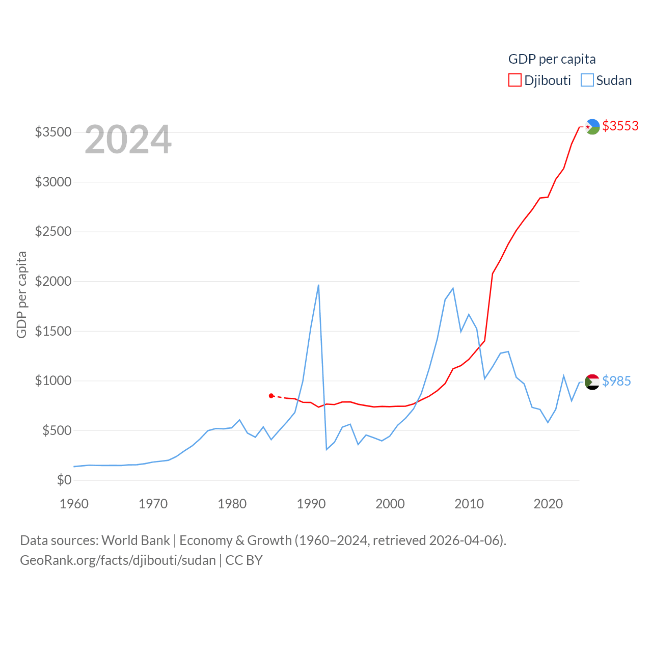 By GDP, Djibouti ranks 165/197 ($4.15B) and Sudan ranks 94/197 ($49.7B). By GDP per capita, Djibouti ranks 133/197 ($3,553), while Sudan ranks 179/197 ($985).