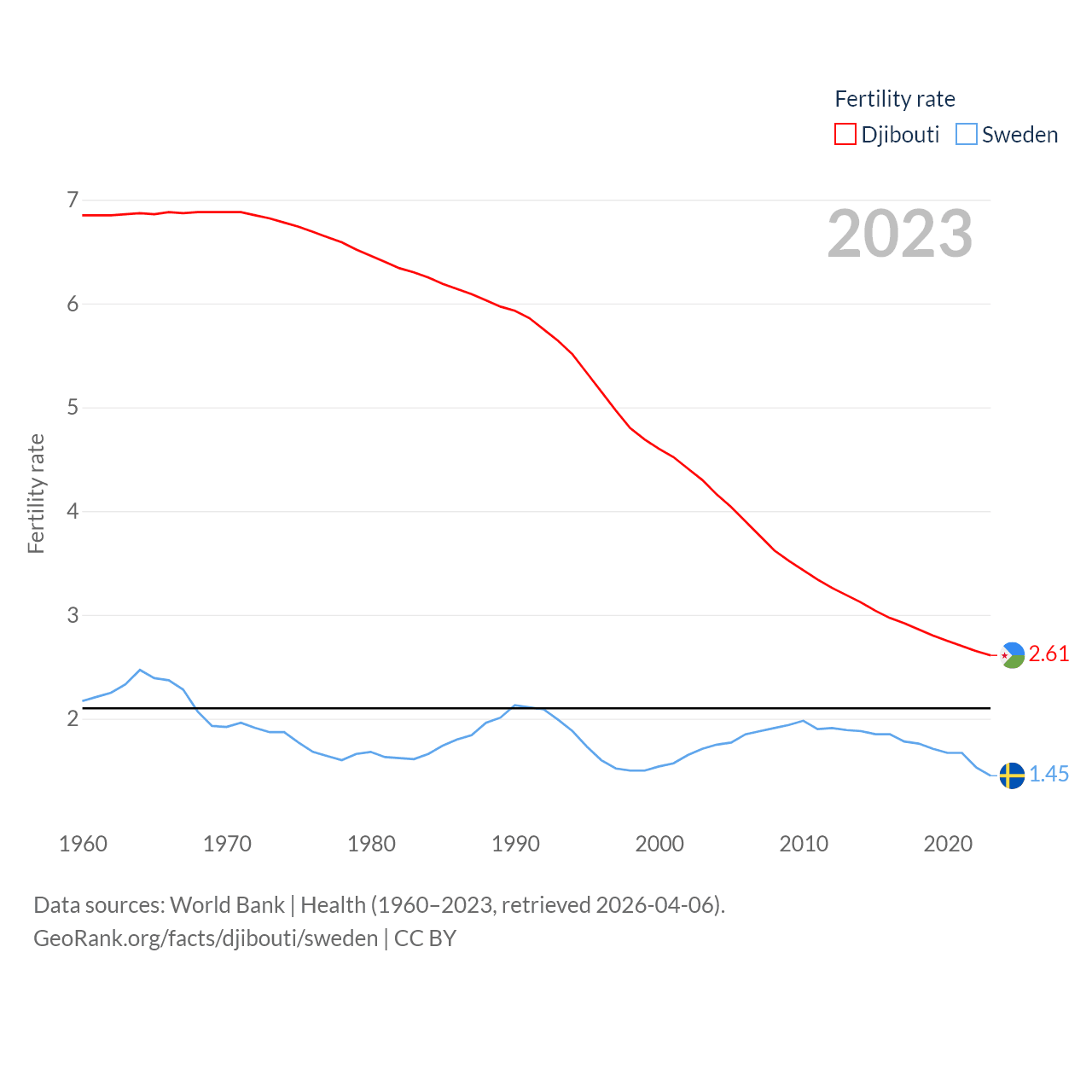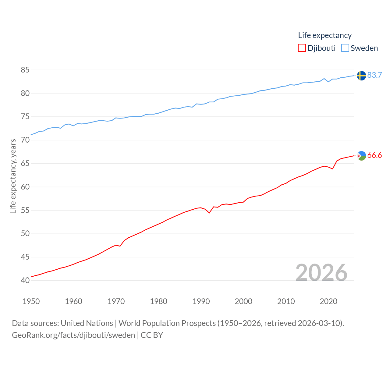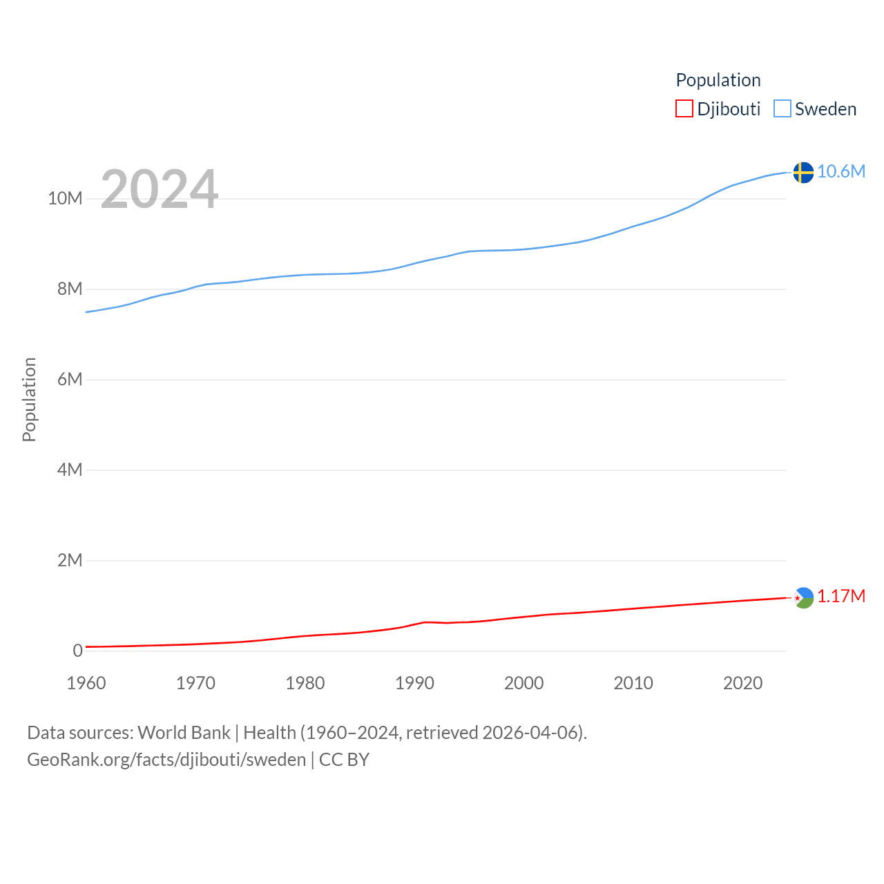 Djibouti has a population of 1.17M (ranked 158/197), compared with 10.6M in Sweden (ranked 93/197). Djibouti's land area is 8,950 sq mi versus 157,248 sq mi for Sweden (ranked 147th vs. 58th).