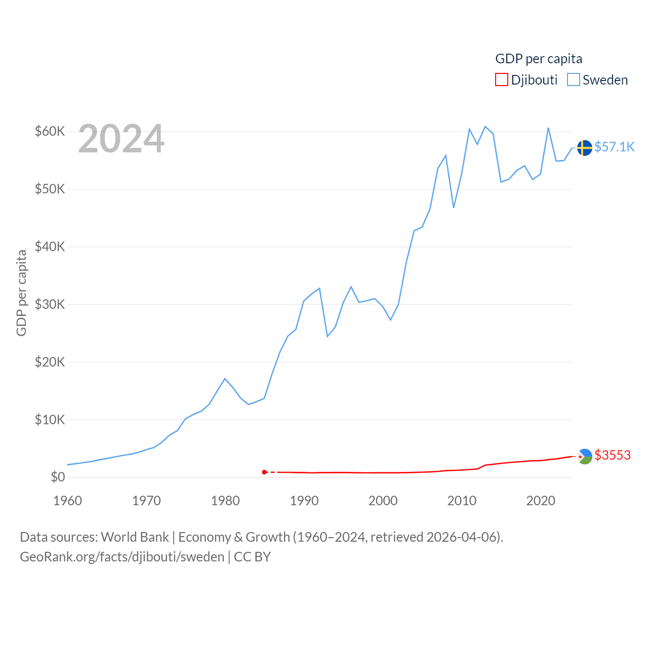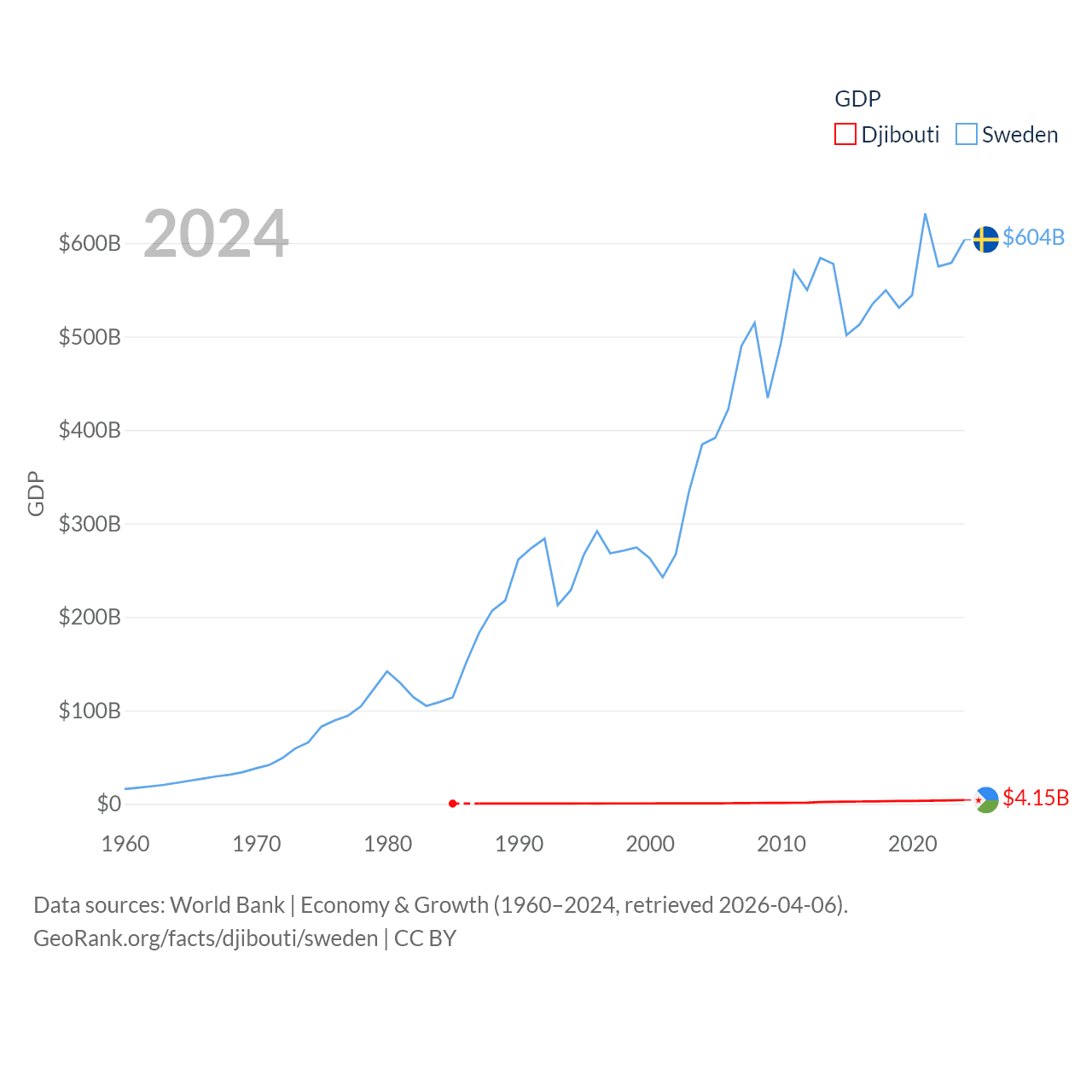 By GDP, Djibouti ranks 165/197 ($4.15B) and Sweden ranks 26/197 ($604B). By GDP per capita, Djibouti ranks 133/197 ($3,553), while Sweden ranks 17/197 ($57,117).