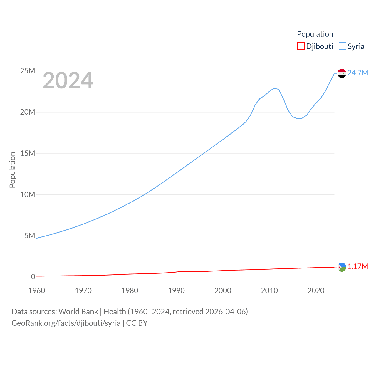 Djibouti has a population of 1.17M (ranked 158/197), compared with 24.7M in Syria (ranked 57/197). Djibouti's land area is 8,950 sq mi versus 70,900 sq mi for Syria (ranked 147th vs. 87th).