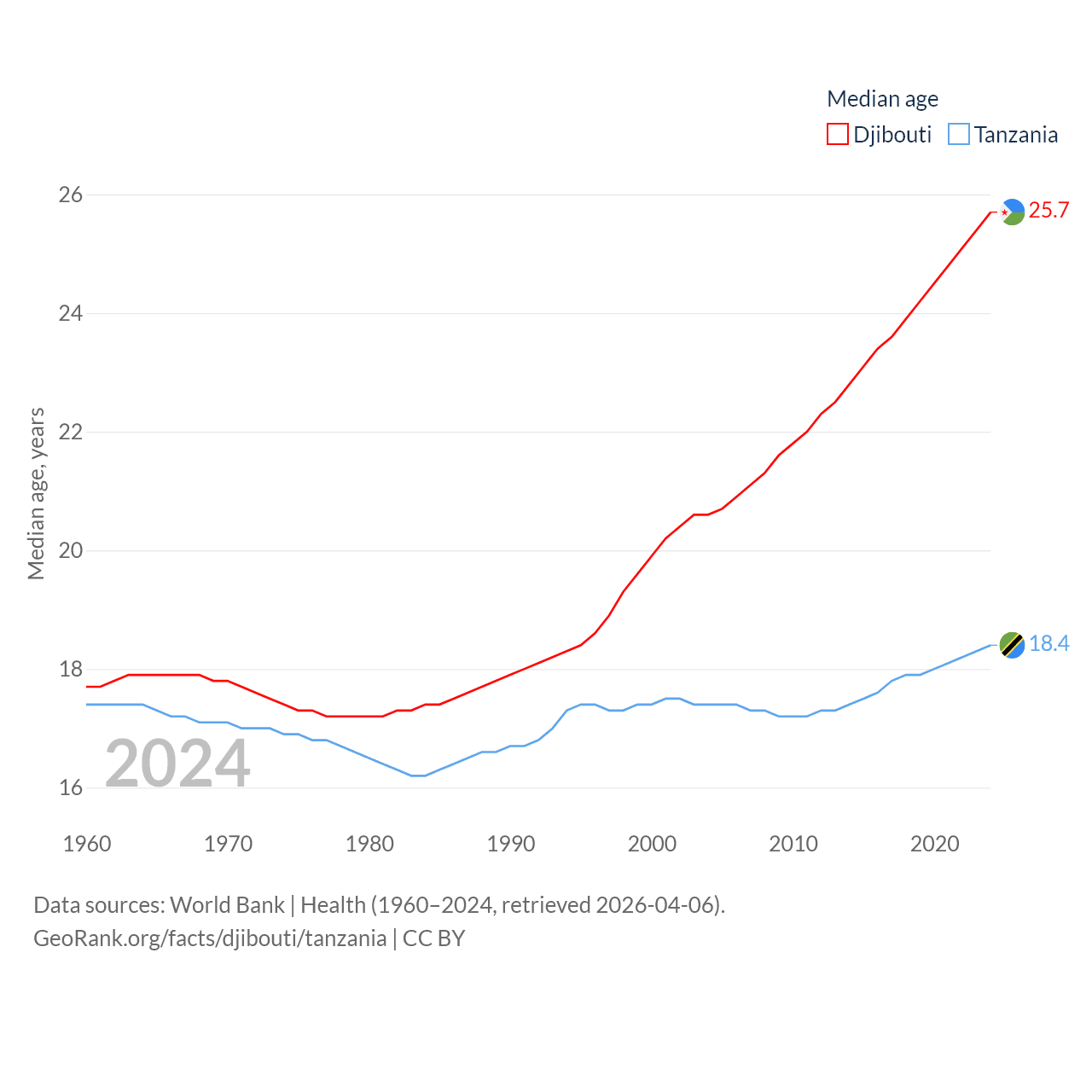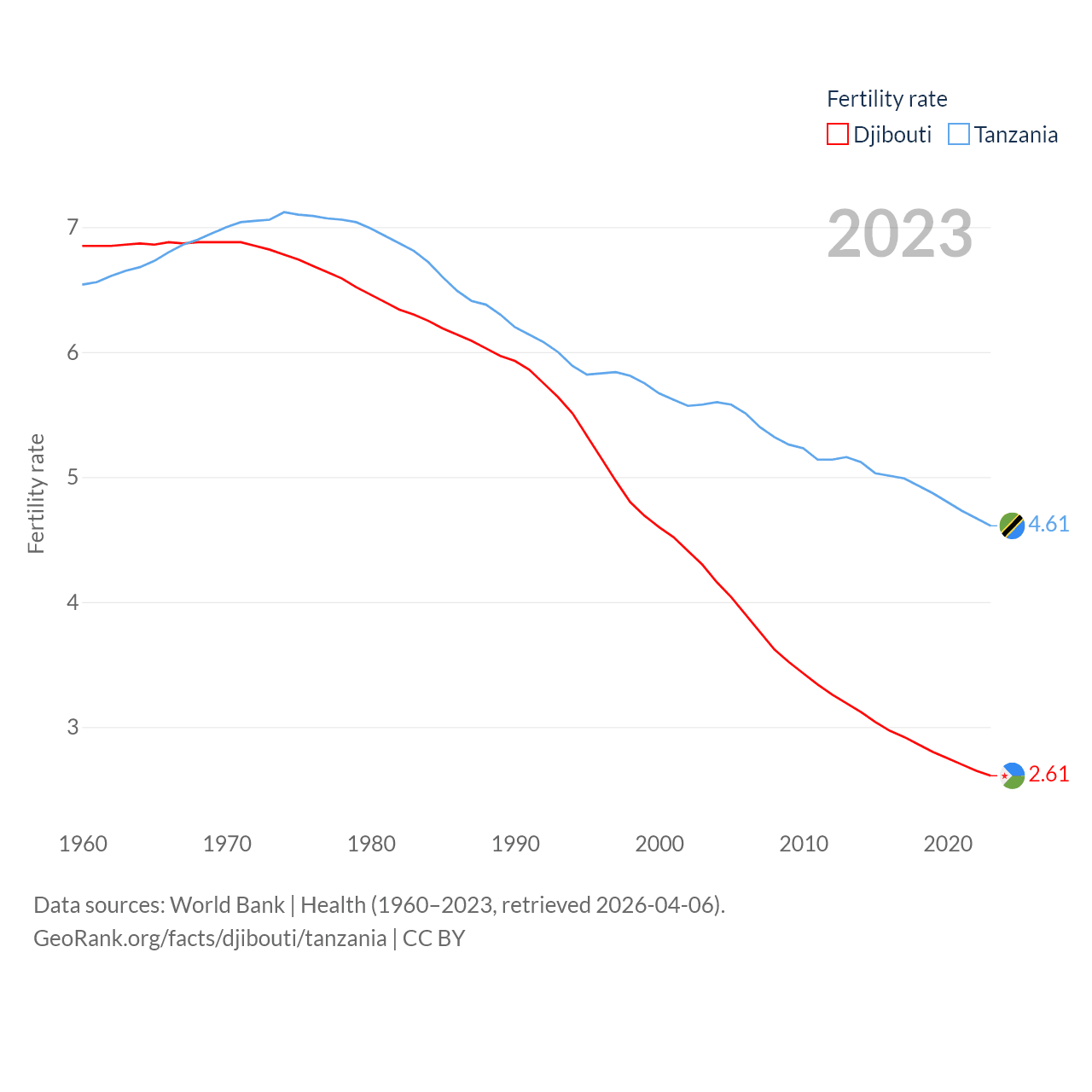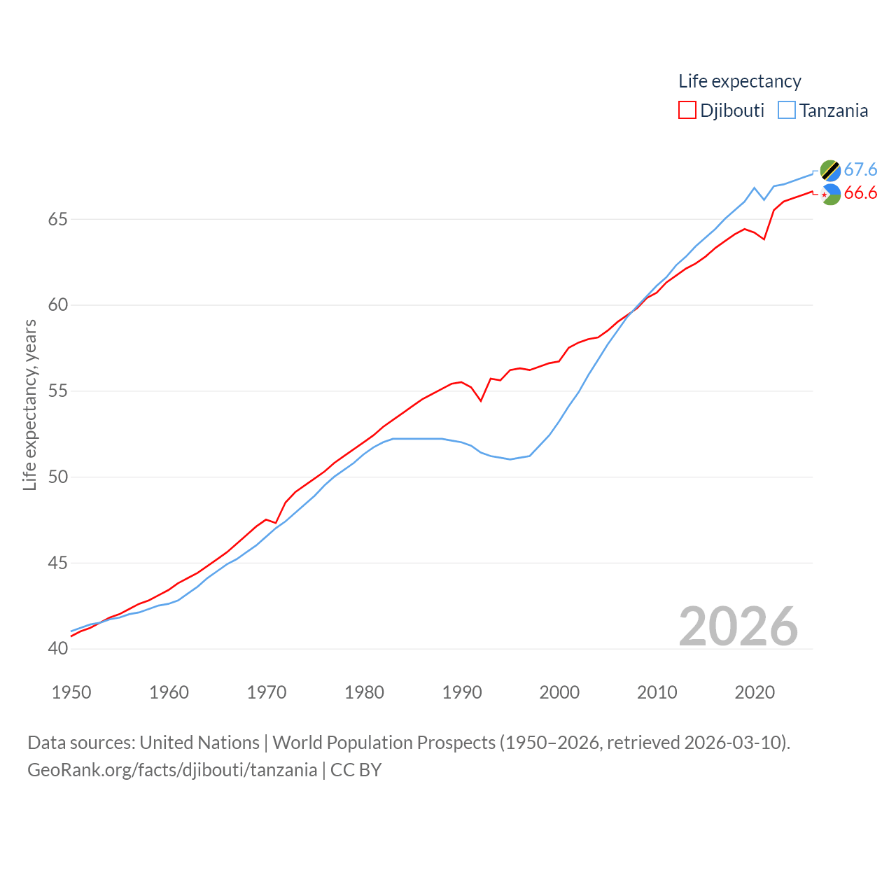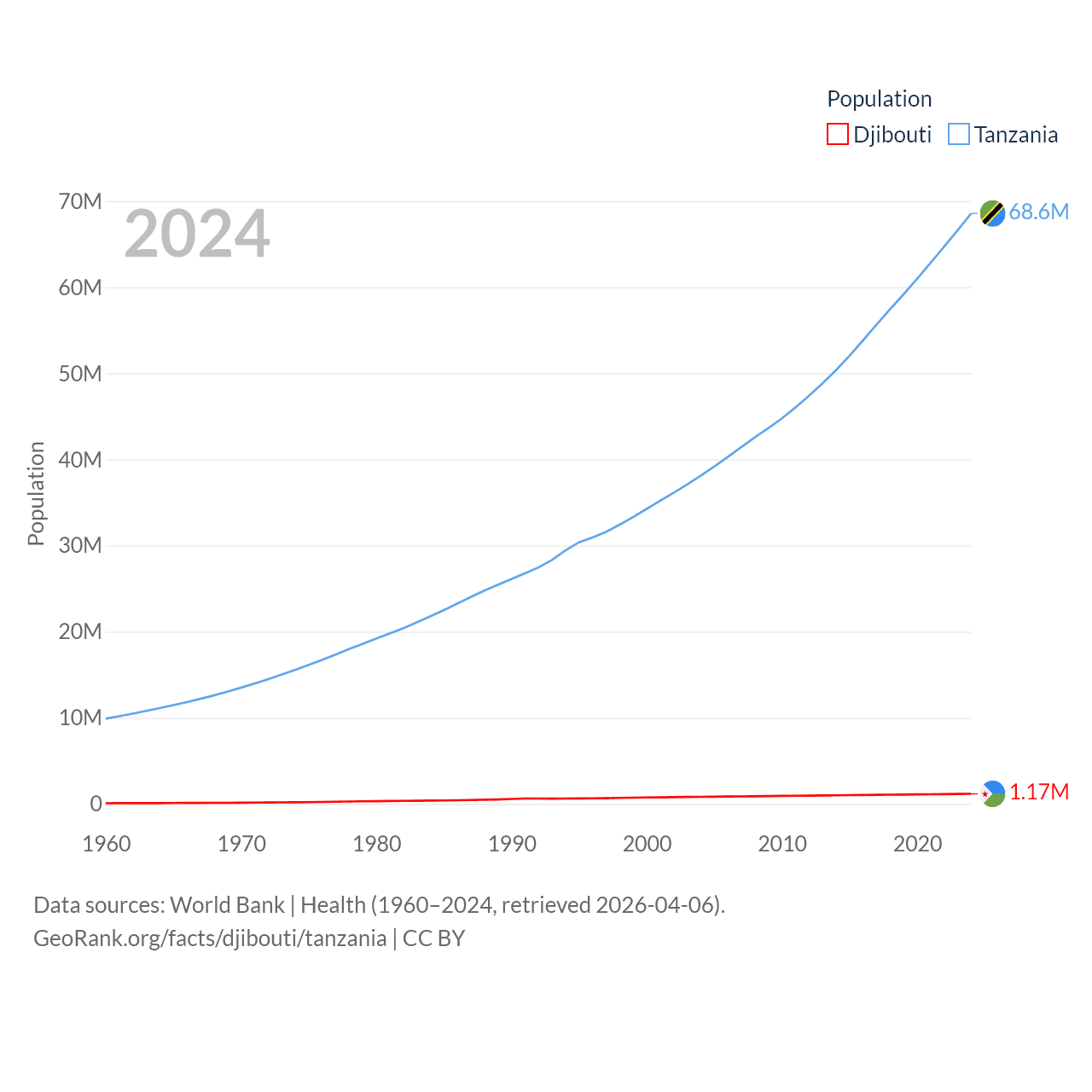 Djibouti has a population of 1.17M (ranked 158/197), compared with 68.6M in Tanzania (ranked 22/197). Djibouti's land area is 8,950 sq mi versus 342,009 sq mi for Tanzania (ranked 147th vs. 31st).