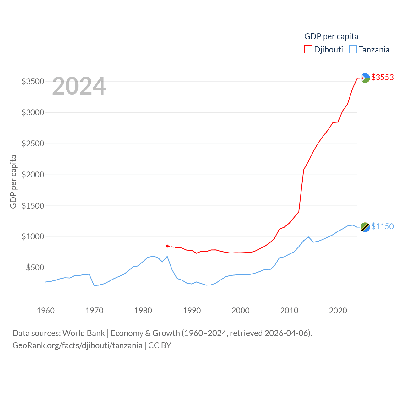 By GDP, Djibouti ranks 165/197 ($4.15B) and Tanzania ranks 82/197 ($78.8B). By GDP per capita, Djibouti ranks 133/197 ($3,553), while Tanzania ranks 170/197 ($1,150).