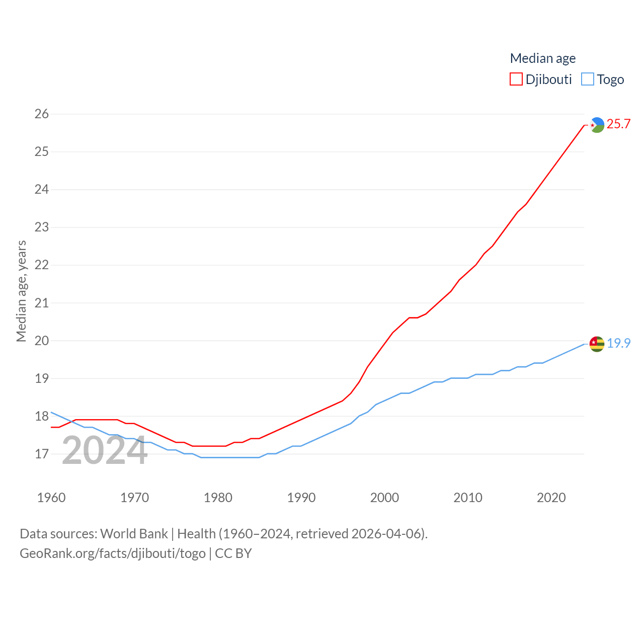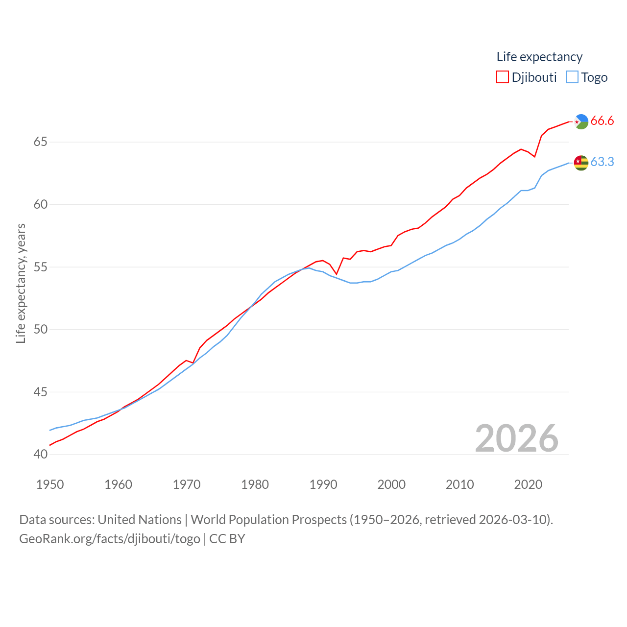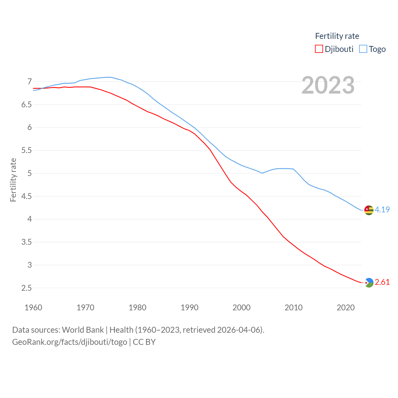 Djibouti has a population of 1.17M (ranked 158/197), compared with 9.52M in Togo (ranked 98/197). Djibouti's land area is 8,950 sq mi versus 21,000 sq mi for Togo (ranked 147th vs. 124th).