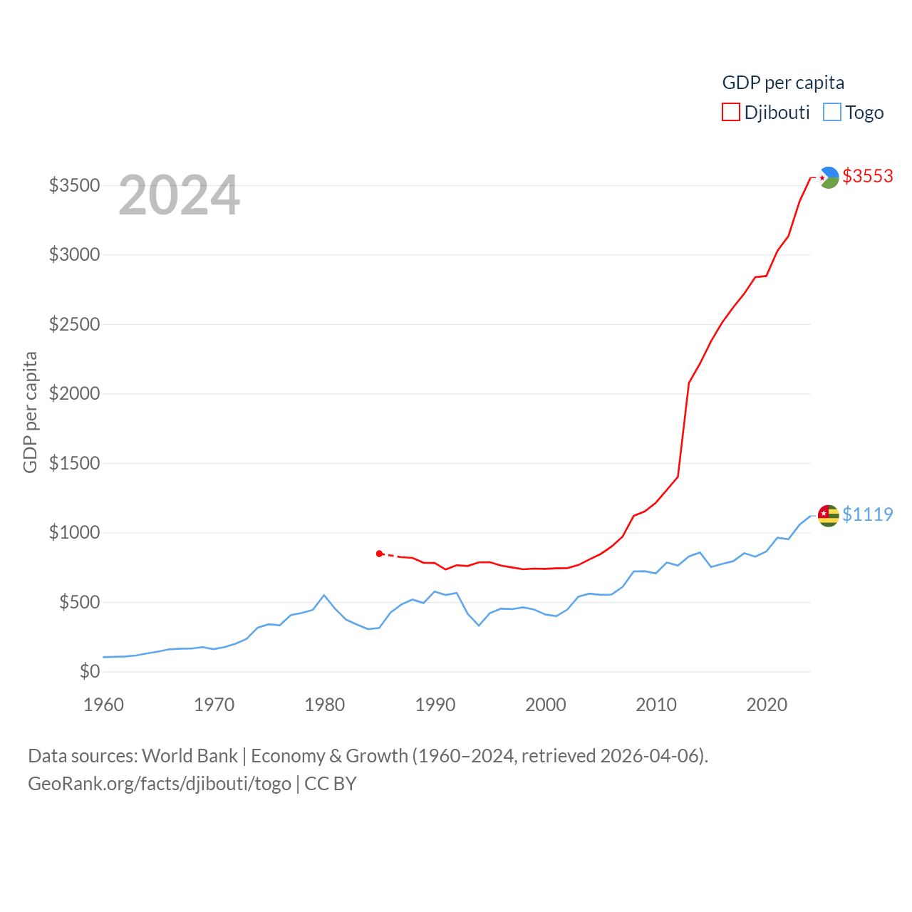 By GDP, Djibouti ranks 165/197 ($4.15B) and Togo ranks 154/197 ($10.7B). By GDP per capita, Djibouti ranks 133/197 ($3,553), while Togo ranks 172/197 ($1,119).