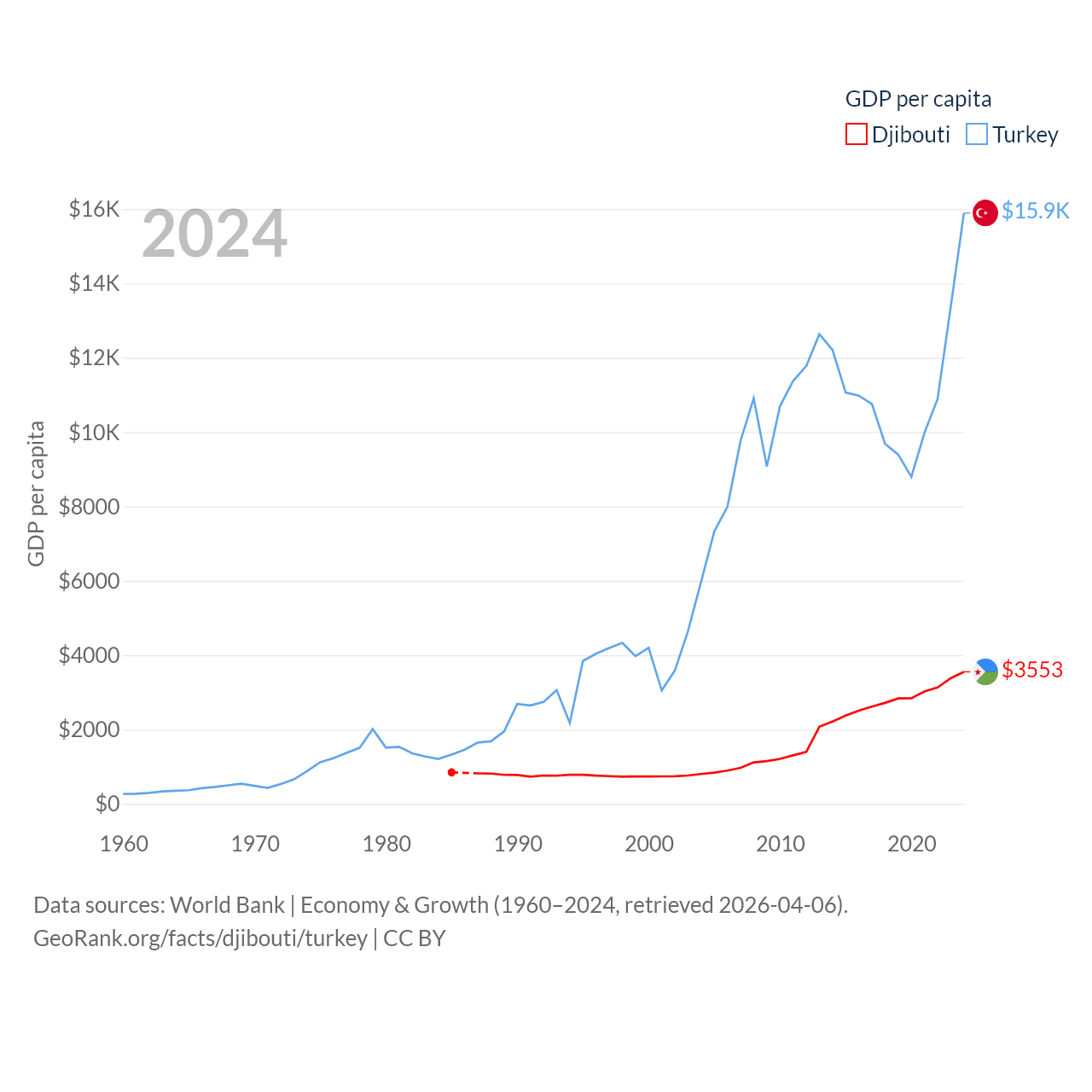 By GDP, Djibouti ranks 165/197 ($4.15B) and Turkey ranks 17/197 ($1.36T). By GDP per capita, Djibouti ranks 133/197 ($3,553), while Turkey ranks 66/197 ($15,893).