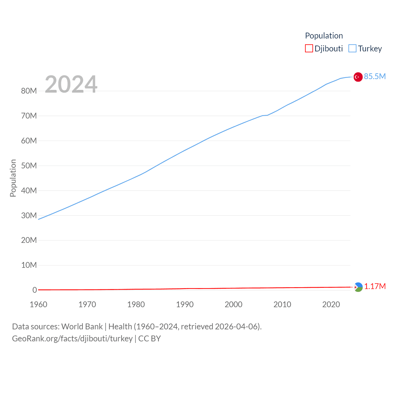 Djibouti has a population of 1.17M (ranked 158/197), compared with 85.5M in Turkey (ranked 18/197). Djibouti's land area is 8,950 sq mi versus 297,156 sq mi for Turkey (ranked 147th vs. 36th).