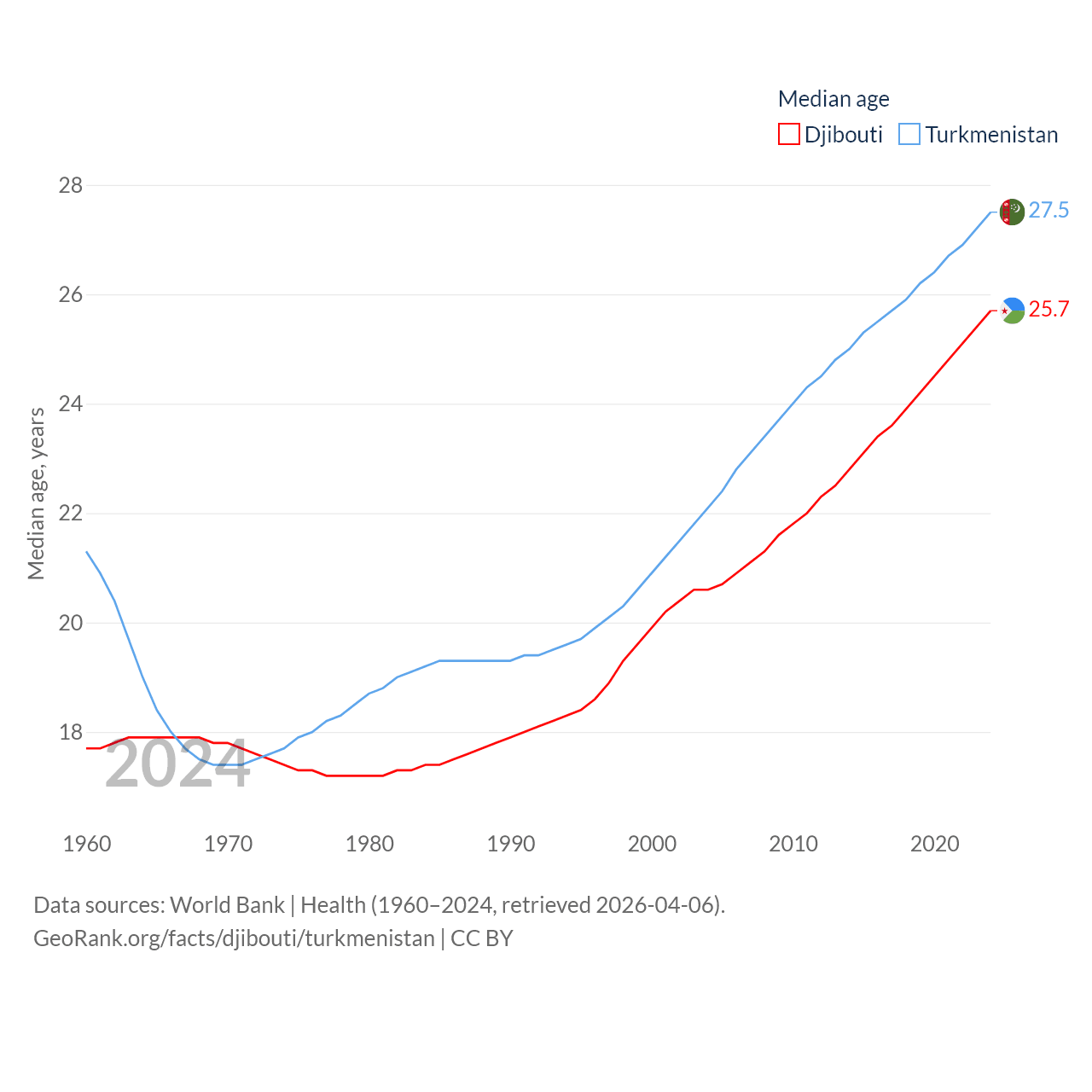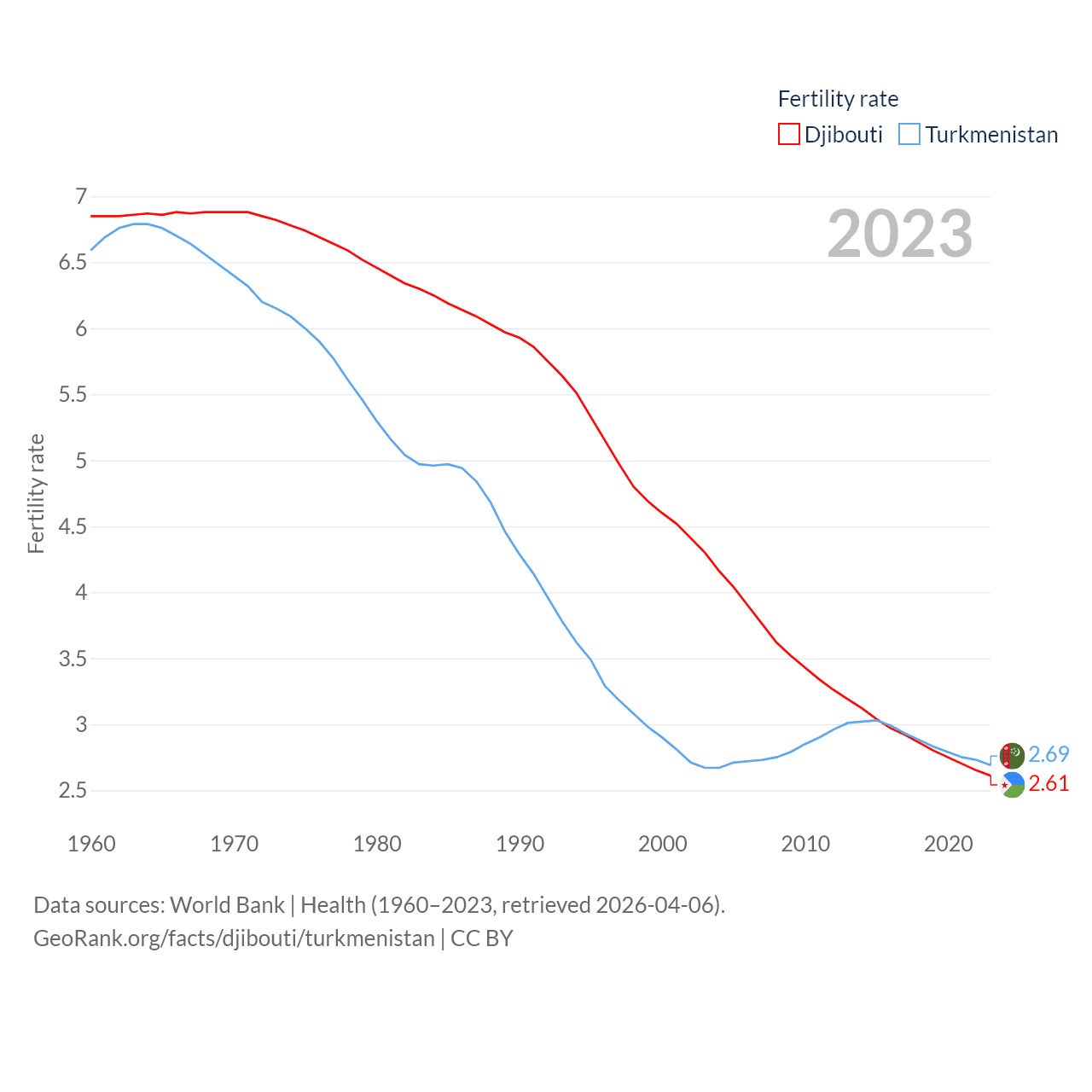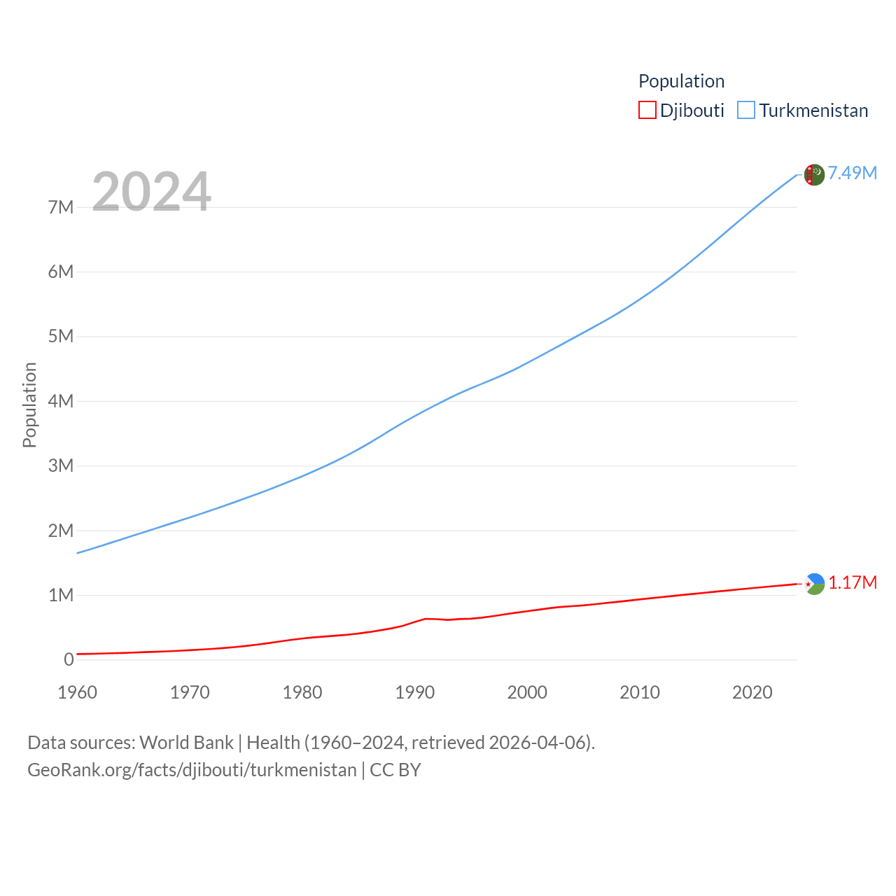 Djibouti has a population of 1.17M (ranked 158/197), compared with 7.49M in Turkmenistan (ranked 104/197). Djibouti's land area is 8,950 sq mi versus 181,441 sq mi for Turkmenistan (ranked 147th vs. 53rd).