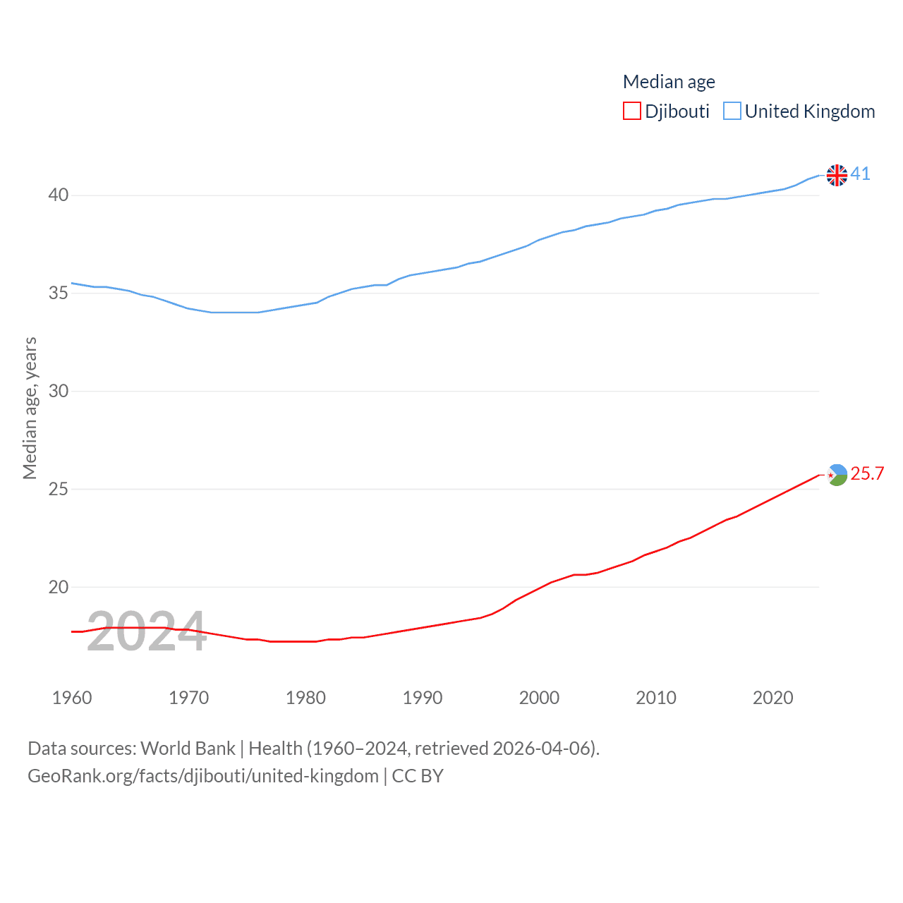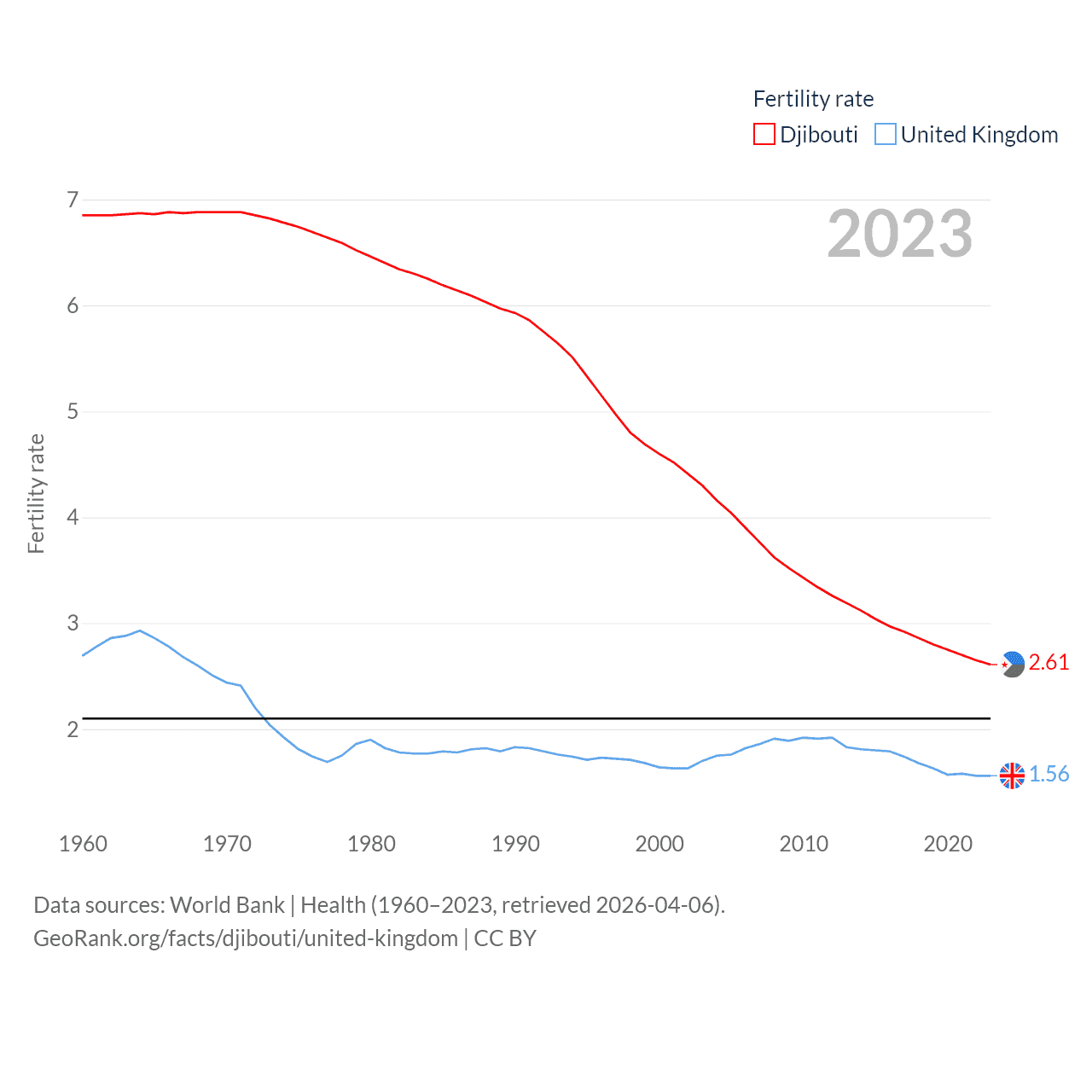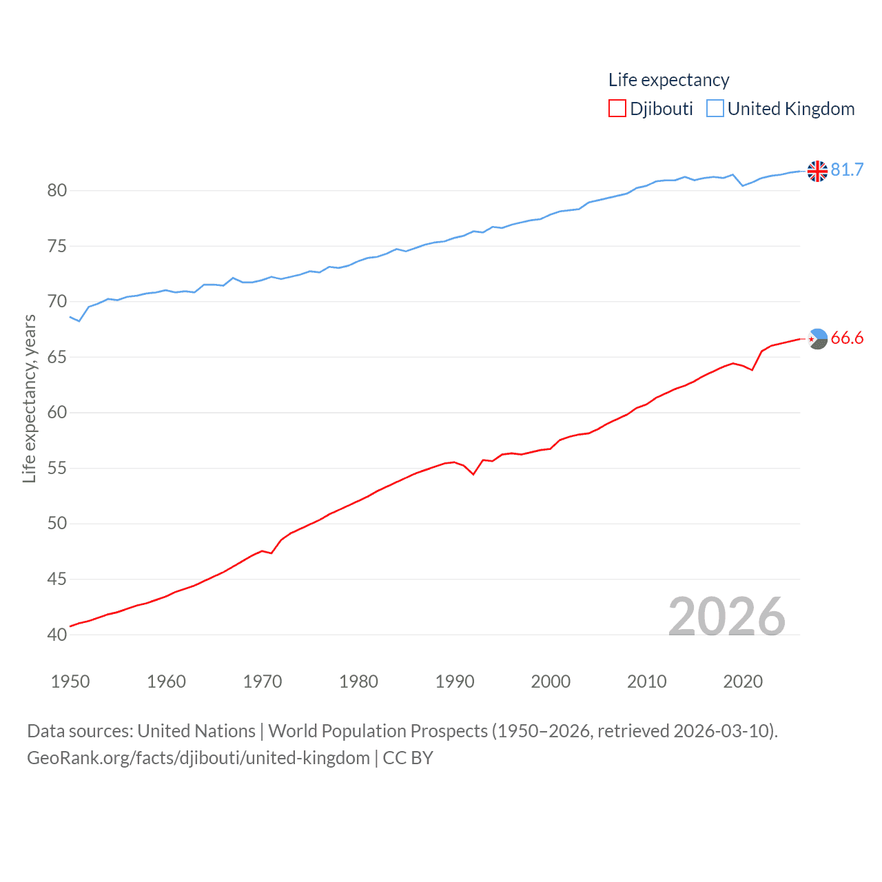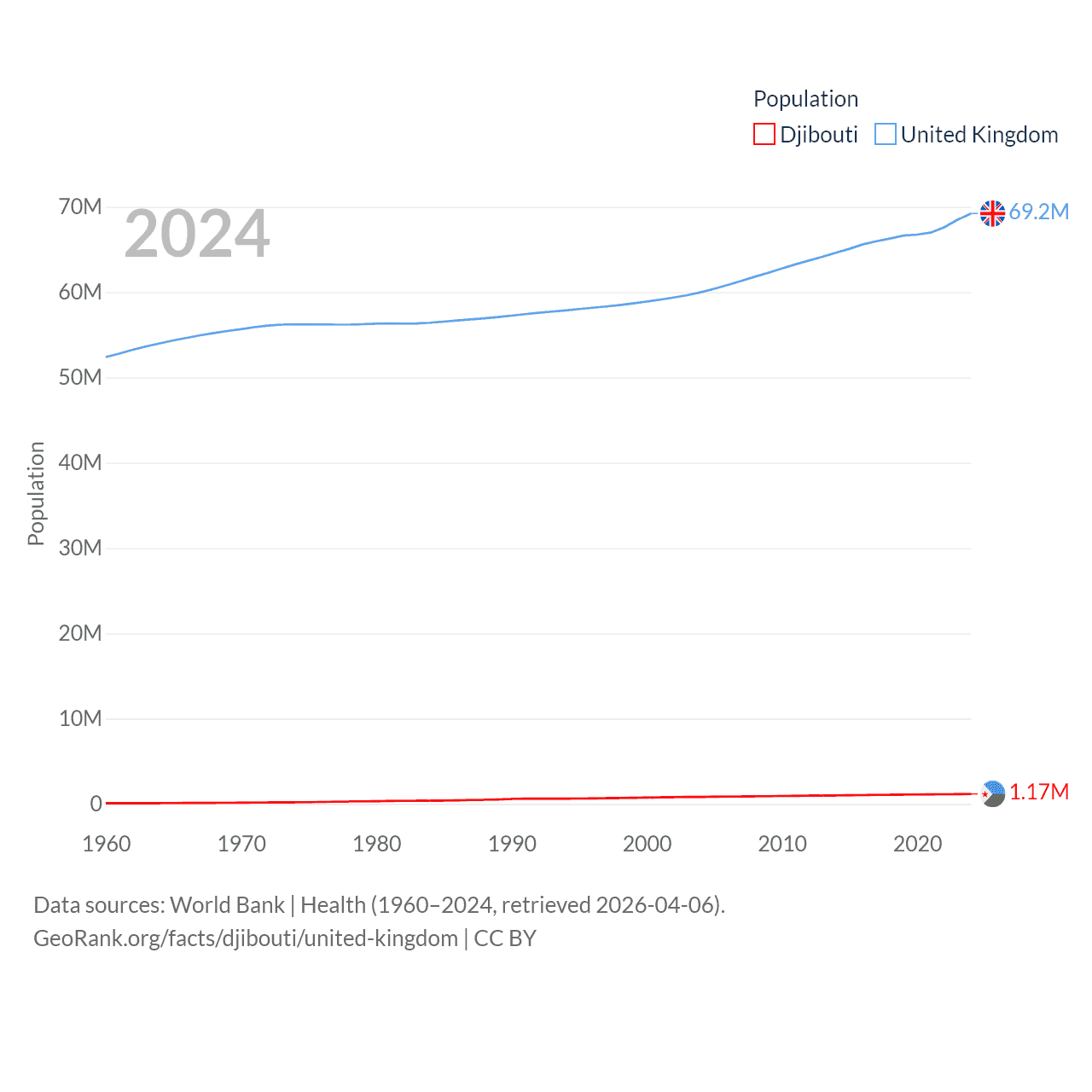 Djibouti has a population of 1.17M (ranked 158/197), compared with 69.2M in The United Kingdom (ranked 21/197). Djibouti's land area is 8,950 sq mi versus 93,410 sq mi for The United Kingdom (ranked 147th vs. 78th).