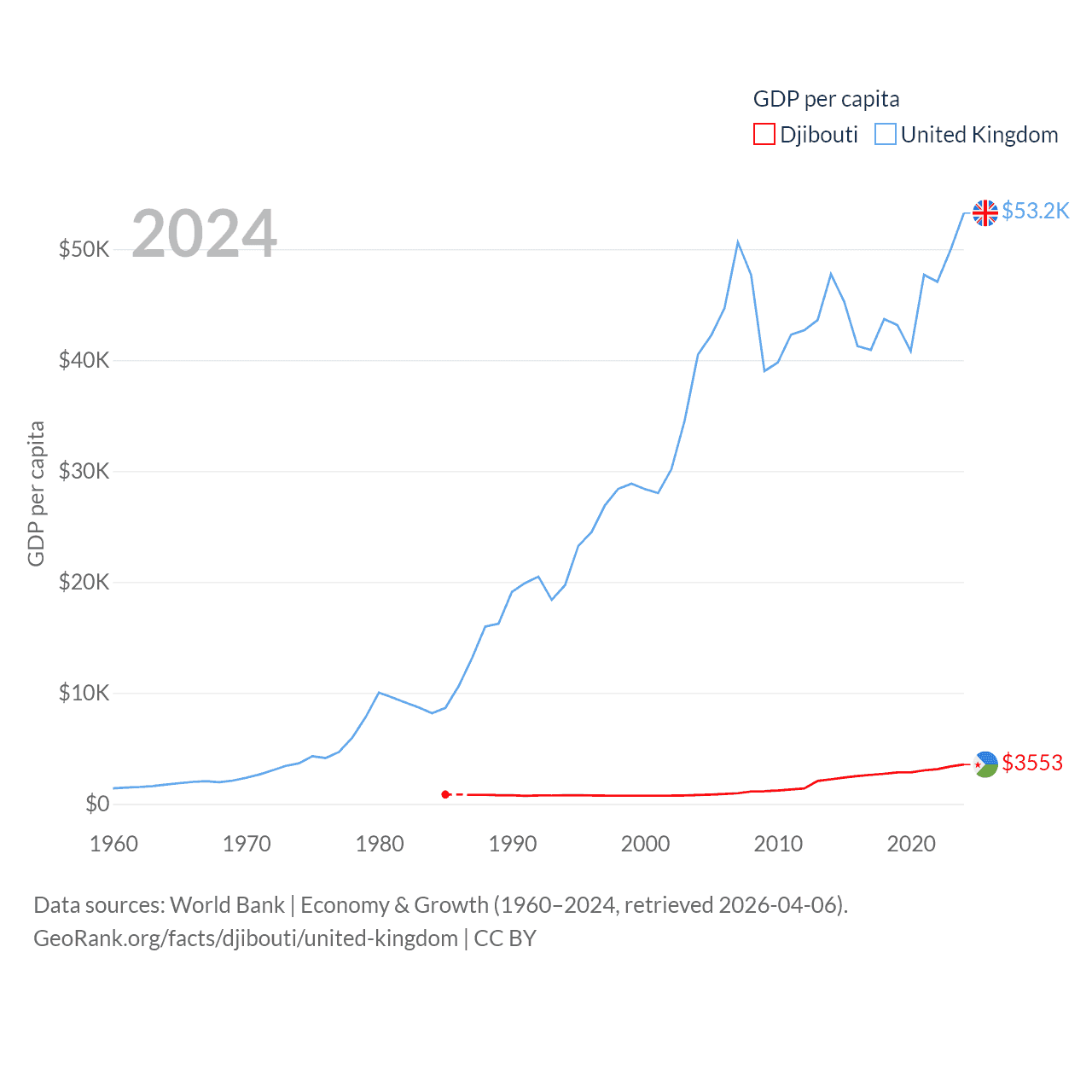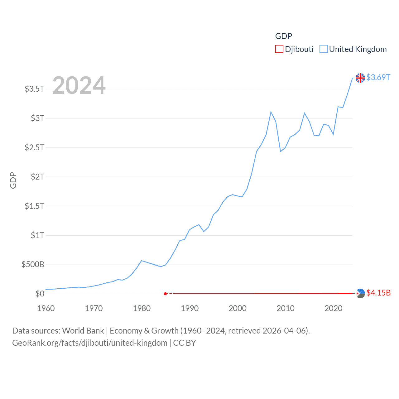By GDP, Djibouti ranks 165/197 ($4.15B) and The United Kingdom ranks 6/197 ($3.69T). By GDP per capita, Djibouti ranks 133/197 ($3,553), while The United Kingdom ranks 22/197 ($53,246).