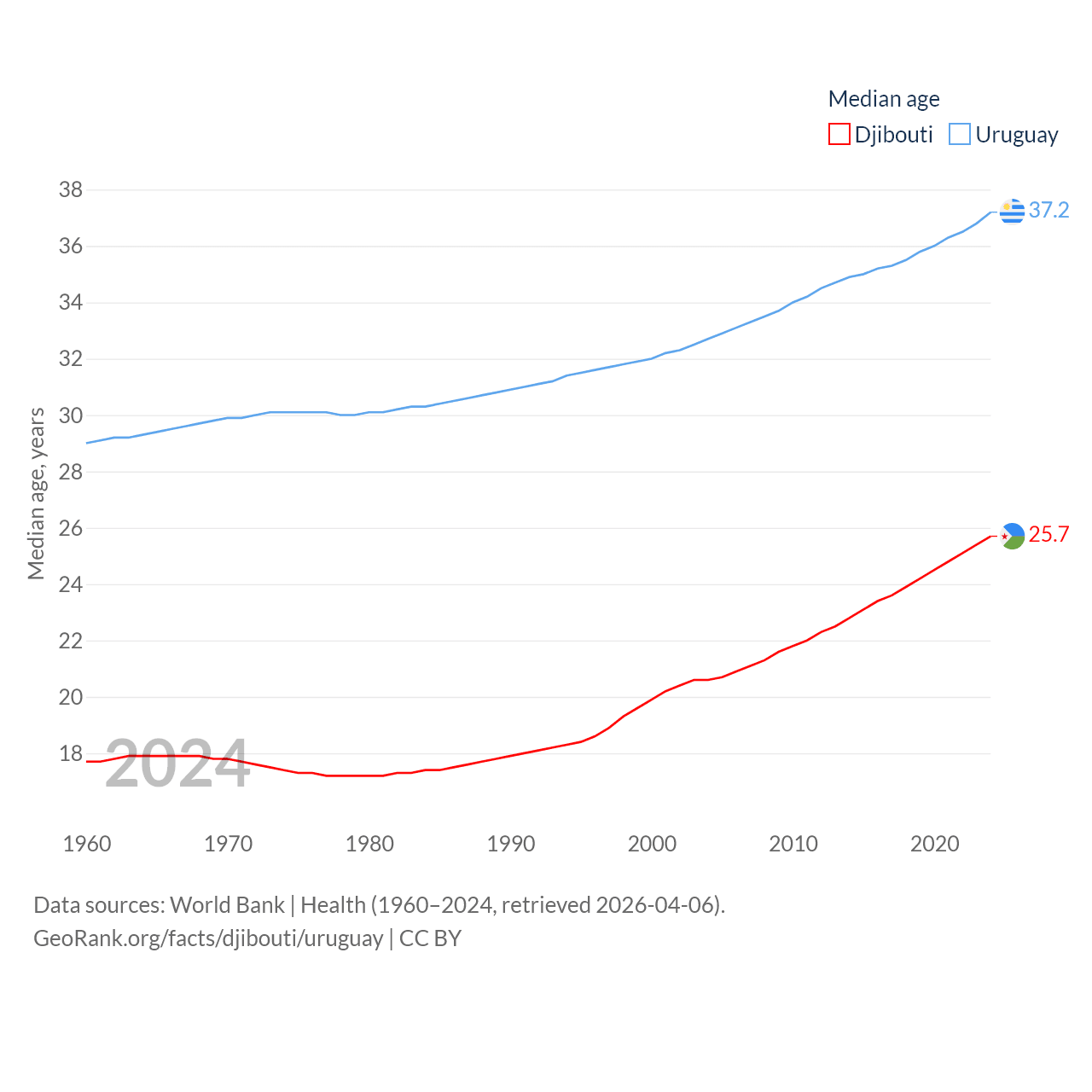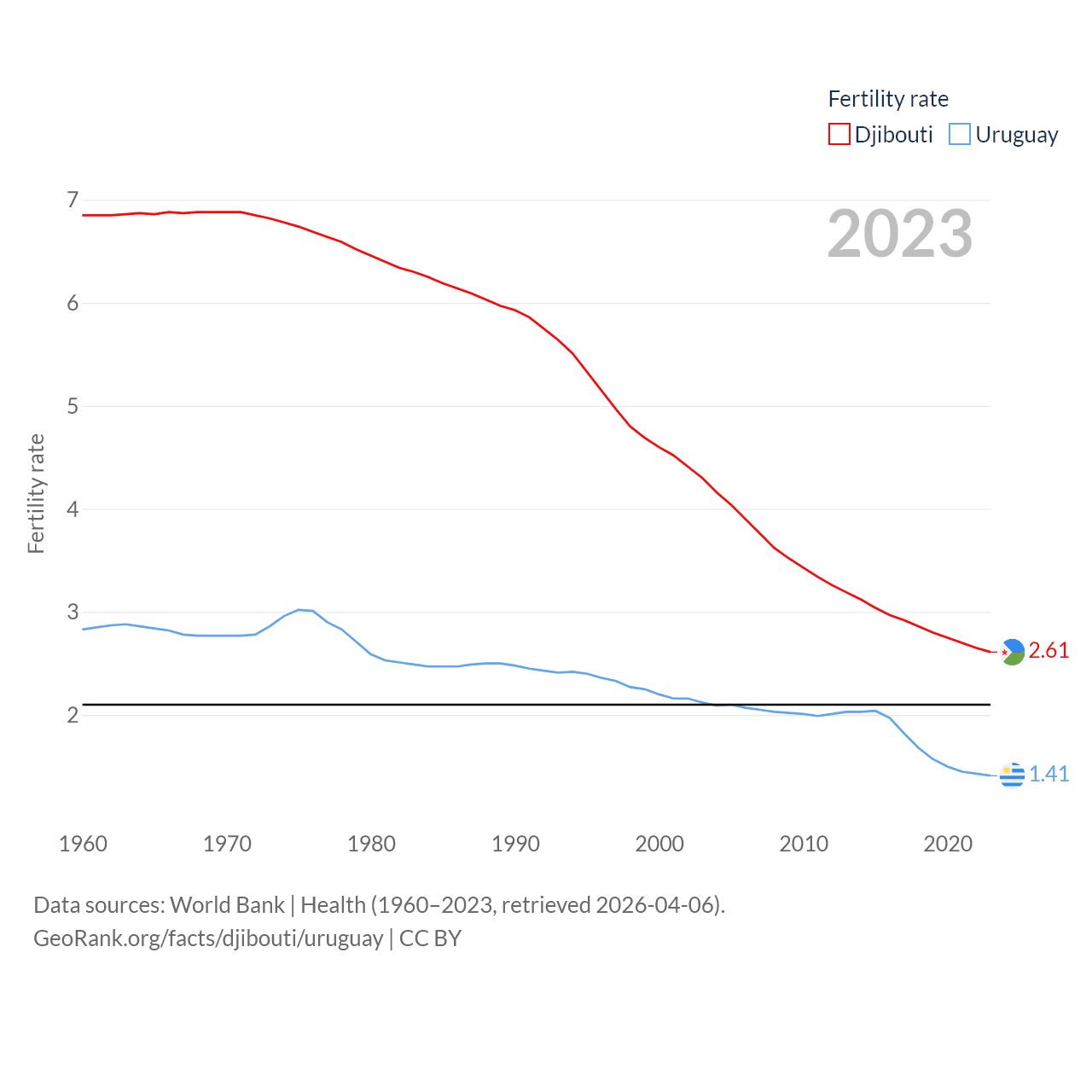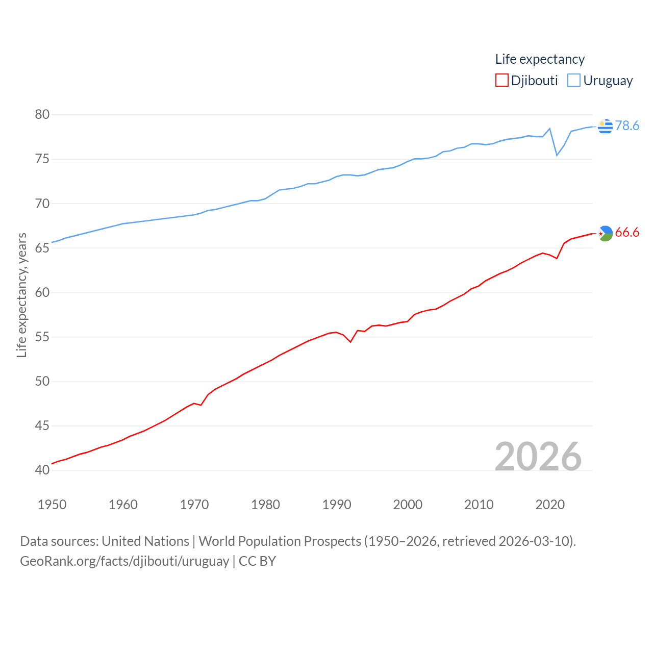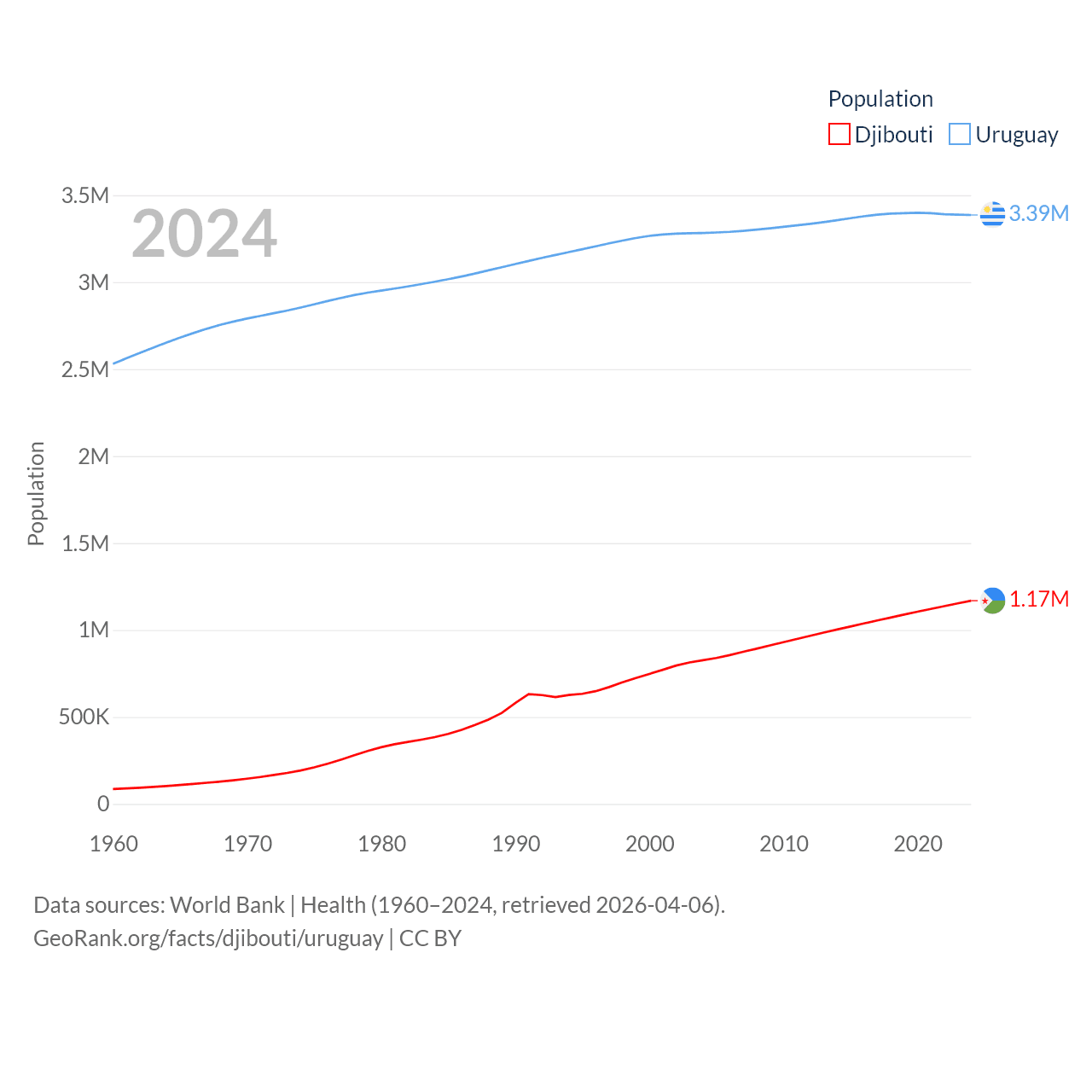 Djibouti has a population of 1.17M (ranked 158/197), compared with 3.39M in Uruguay (ranked 133/197). Djibouti's land area is 8,950 sq mi versus 67,576 sq mi for Uruguay (ranked 147th vs. 89th).