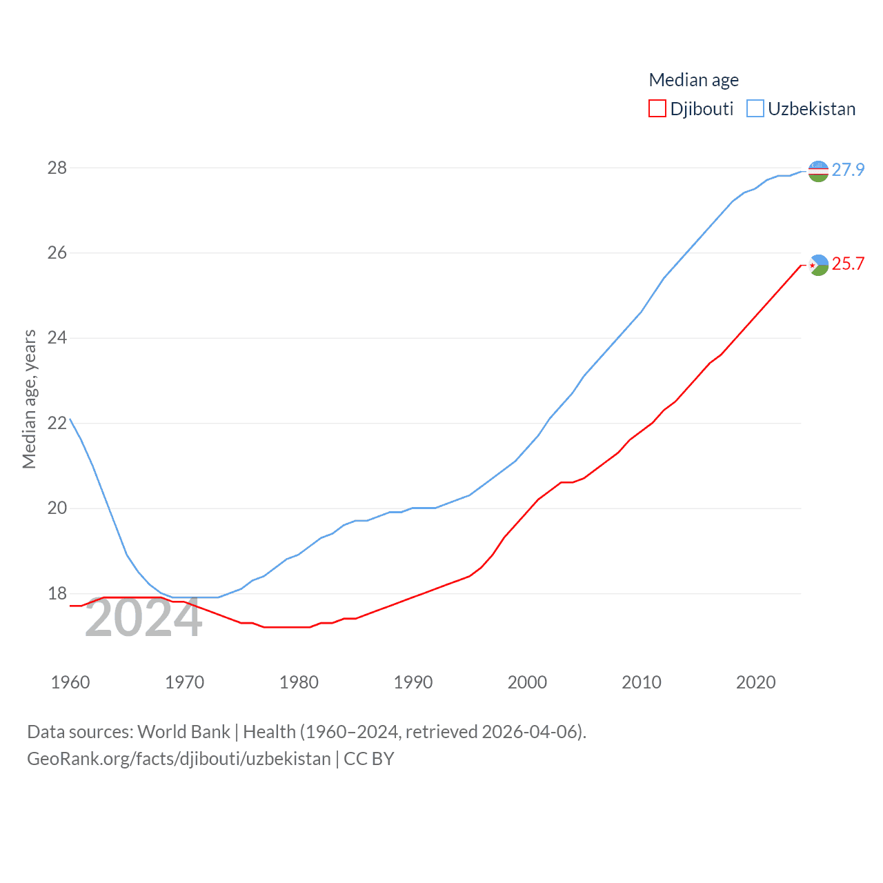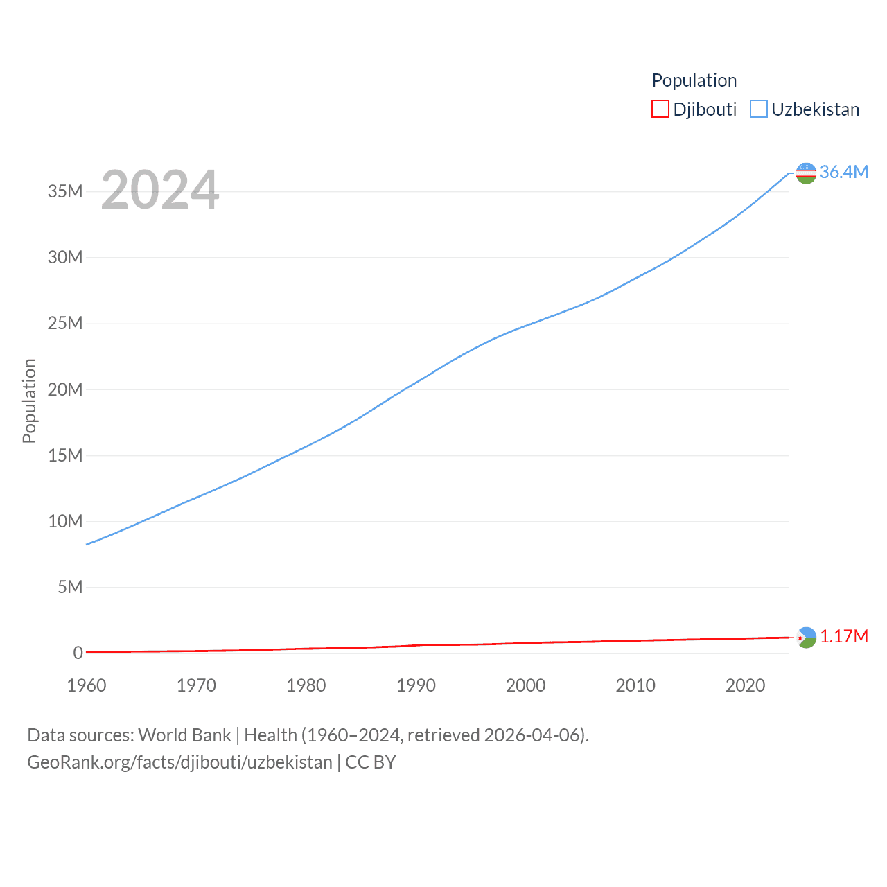 Djibouti has a population of 1.17M (ranked 158/197), compared with 36.4M in Uzbekistan (ranked 43/197). Djibouti's land area is 8,950 sq mi versus 170,136 sq mi for Uzbekistan (ranked 147th vs. 56th).
