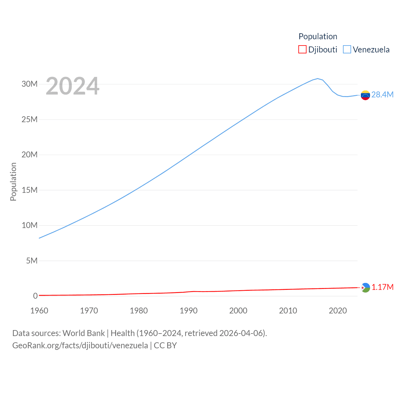Djibouti has a population of 1.17M (ranked 158/197), compared with 28.4M in Venezuela (ranked 53/197). Djibouti's land area is 8,950 sq mi versus 340,561 sq mi for Venezuela (ranked 147th vs. 32nd).