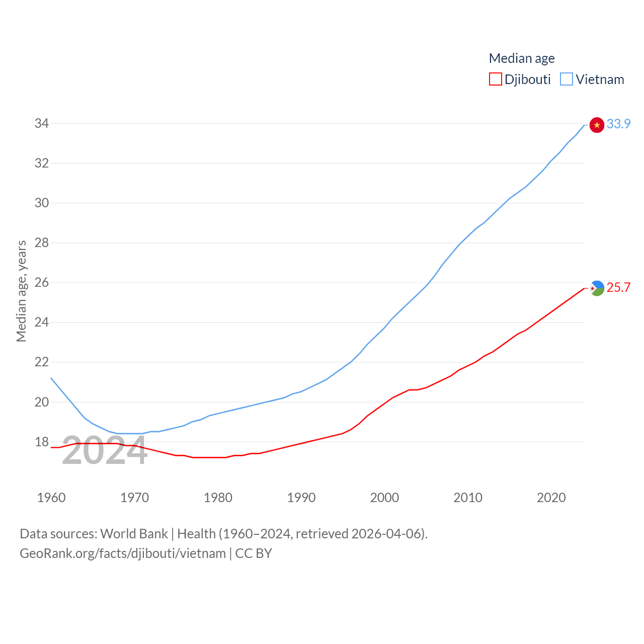 Djibouti has a population of 1.17M (ranked 158/197), compared with 101M in Vietnam (ranked 16/197). Djibouti's land area is 8,950 sq mi versus 121,016 sq mi for Vietnam (ranked 147th vs. 67th).