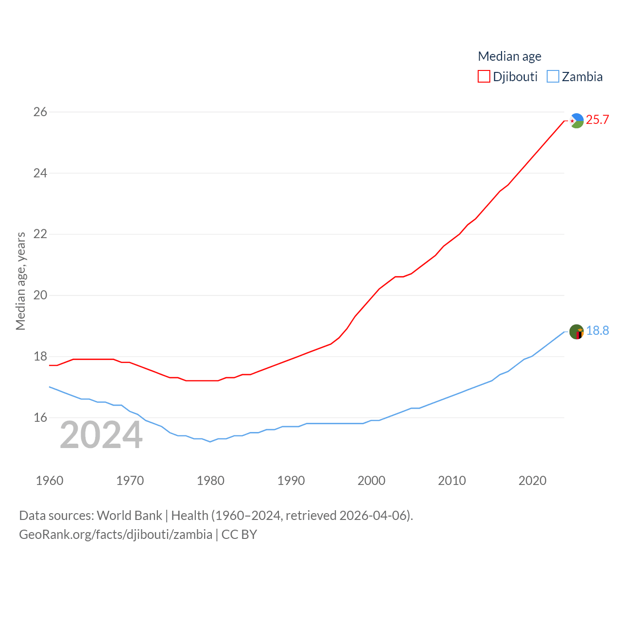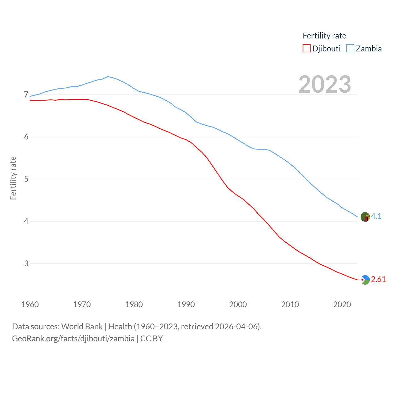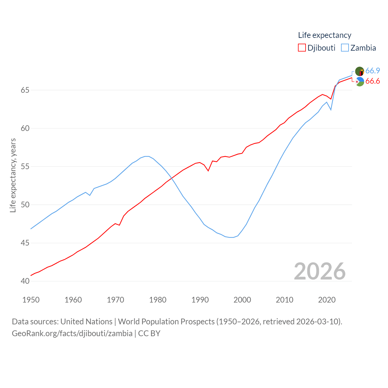 Djibouti has a population of 1.17M (ranked 158/197), compared with 21.3M in Zambia (ranked 63/197). Djibouti's land area is 8,950 sq mi versus 287,024 sq mi for Zambia (ranked 147th vs. 37th).