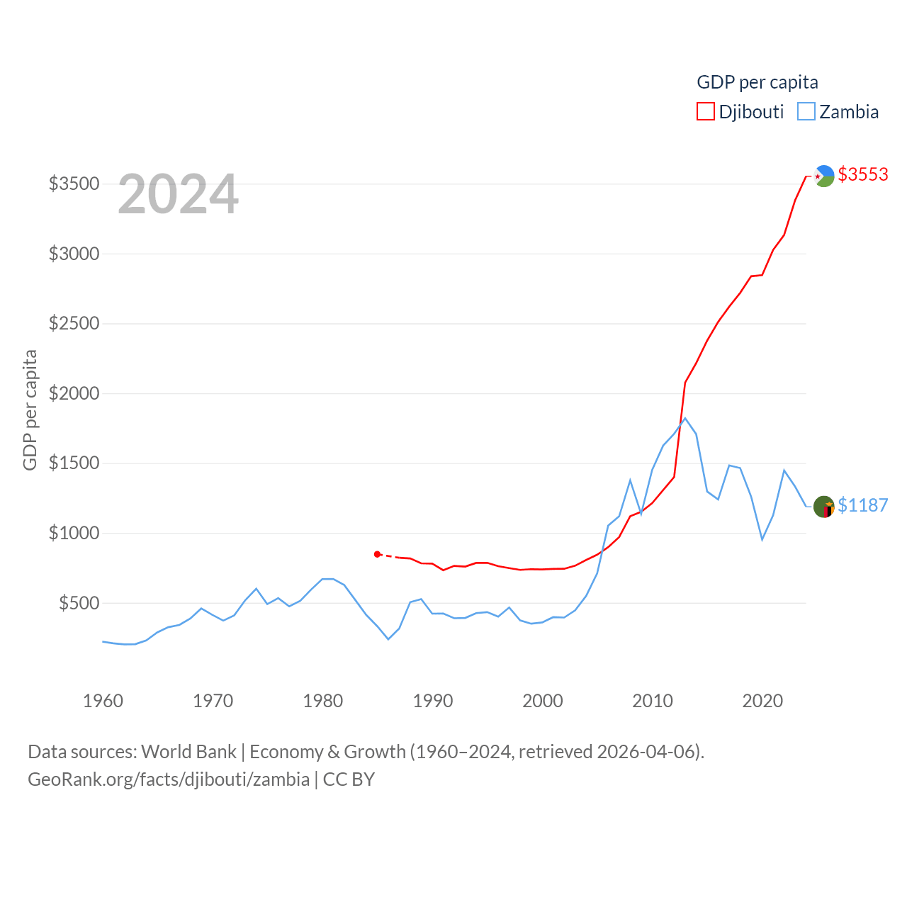 By GDP, Djibouti ranks 165/197 ($4.15B) and Zambia ranks 116/197 ($25.3B). By GDP per capita, Djibouti ranks 133/197 ($3,553), while Zambia ranks 169/197 ($1,187).
