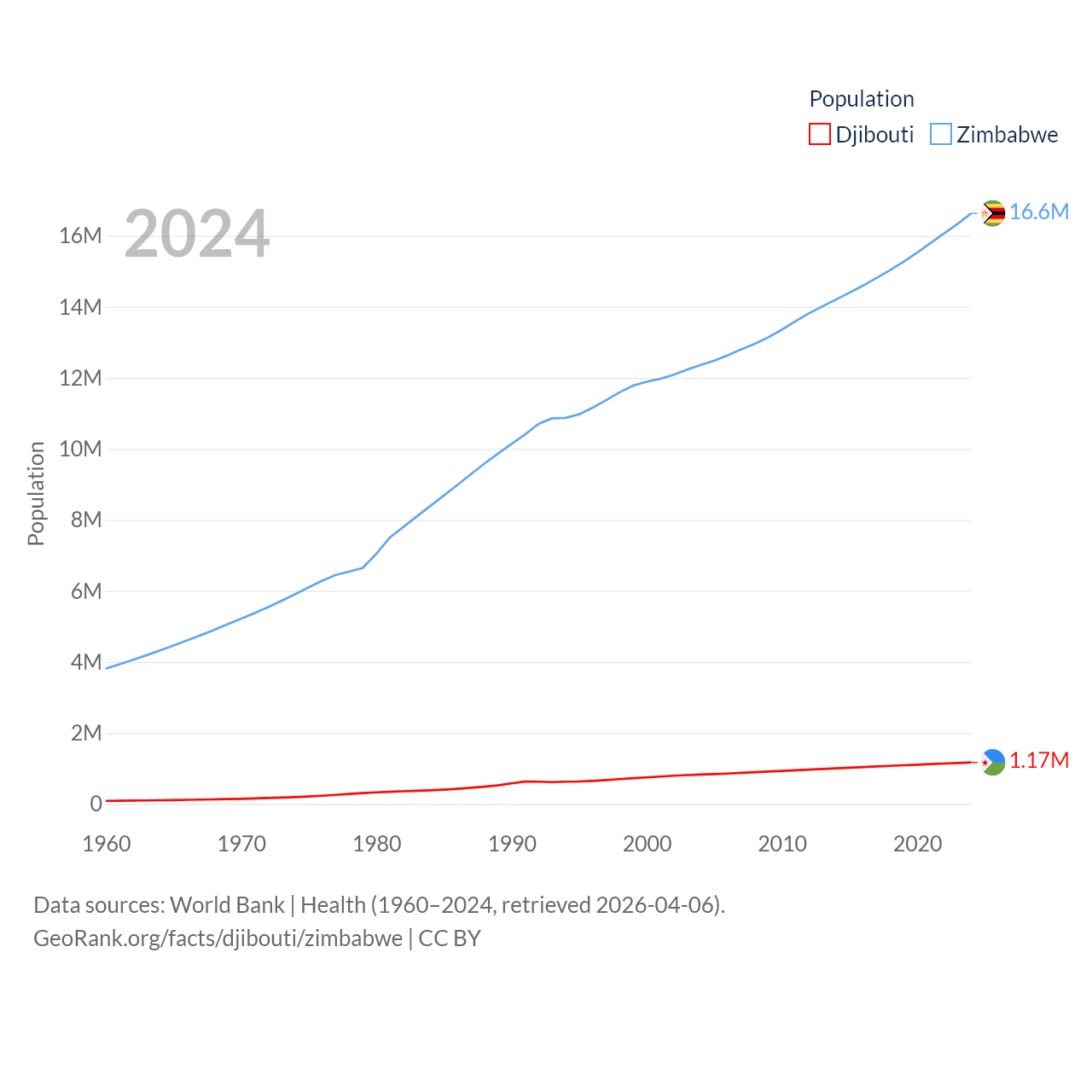 Djibouti has a population of 1.17M (ranked 158/197), compared with 16.6M in Zimbabwe (ranked 74/197). Djibouti's land area is 8,950 sq mi versus 149,364 sq mi for Zimbabwe (ranked 147th vs. 60th).