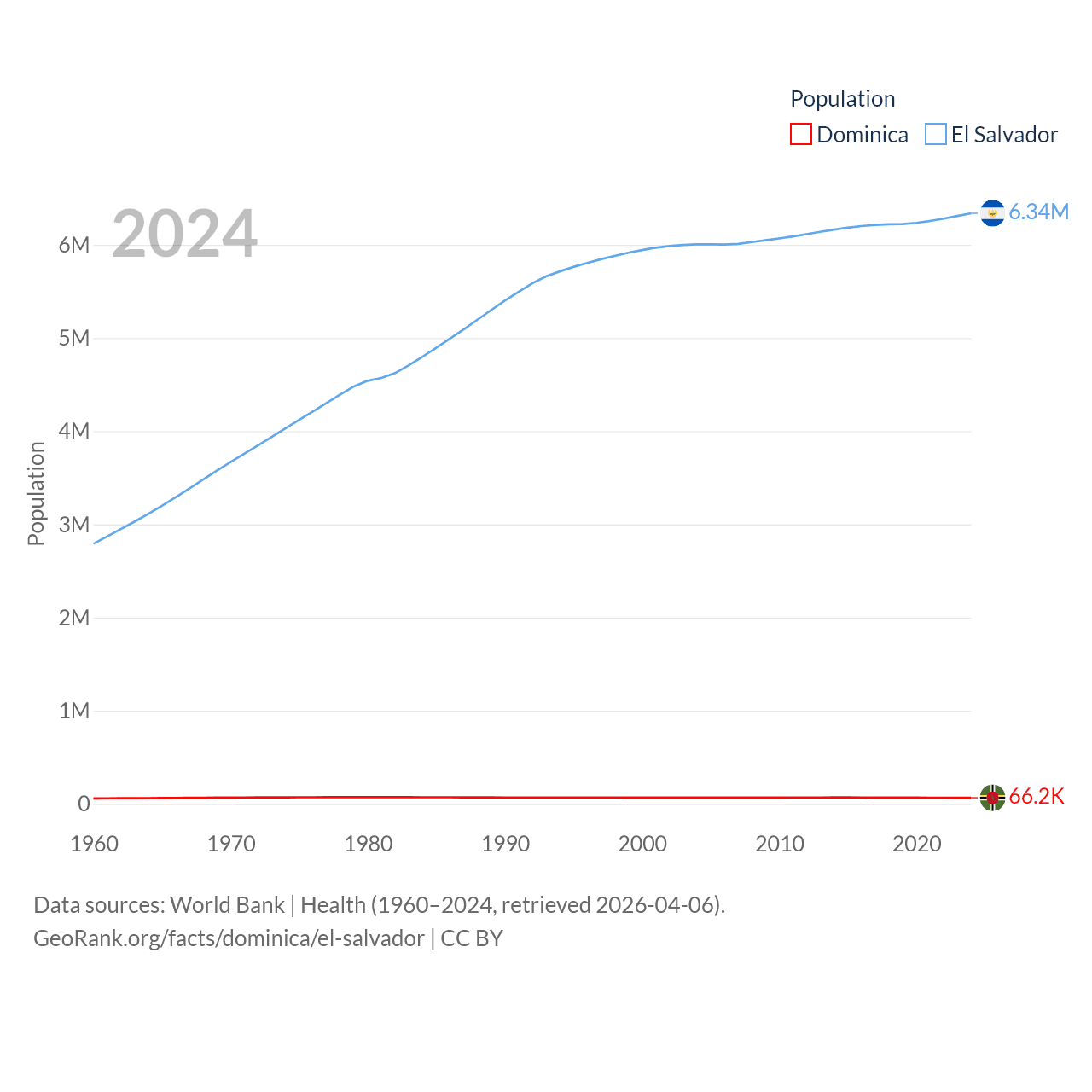 Dominica has a population of 66.2K (ranked 188/197), compared with 6.34M in El Salvador (ranked 111/197). Dominica's land area is 289.6 sq mi versus 8,000 sq mi for El Salvador (ranked 175th vs. 150th).