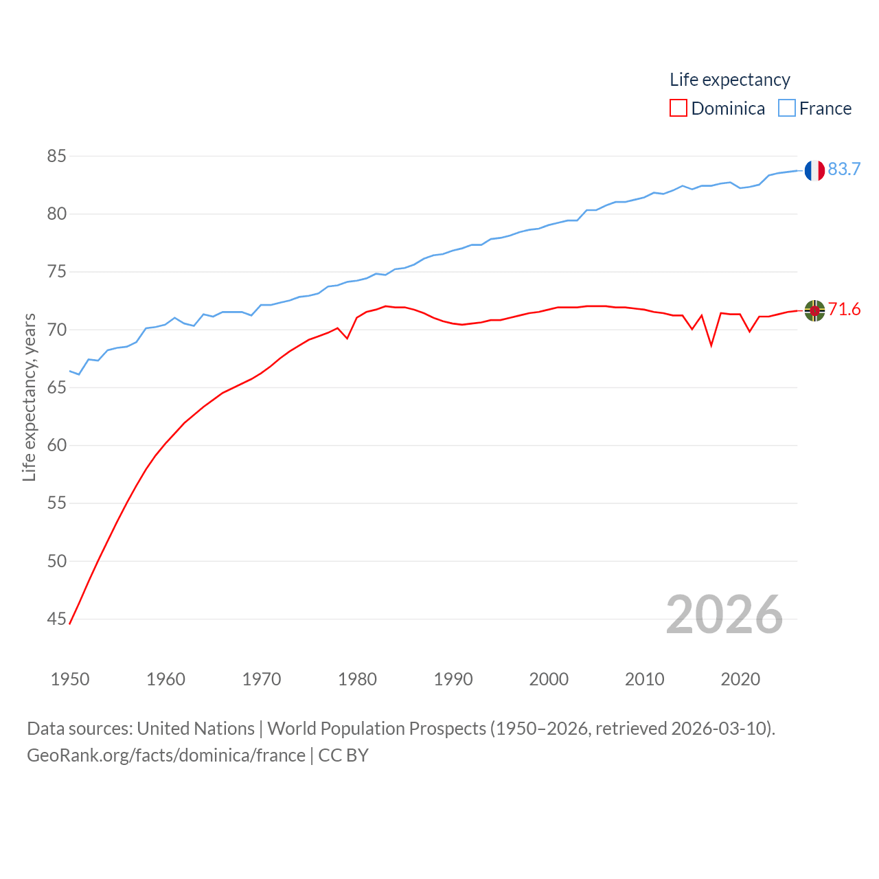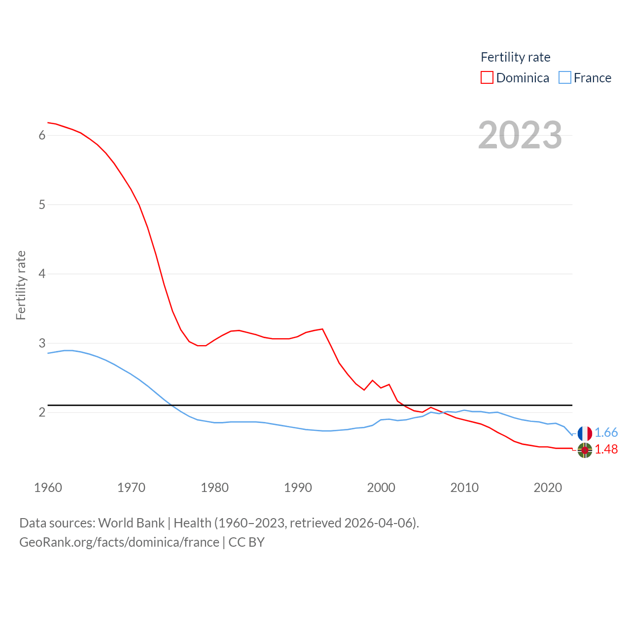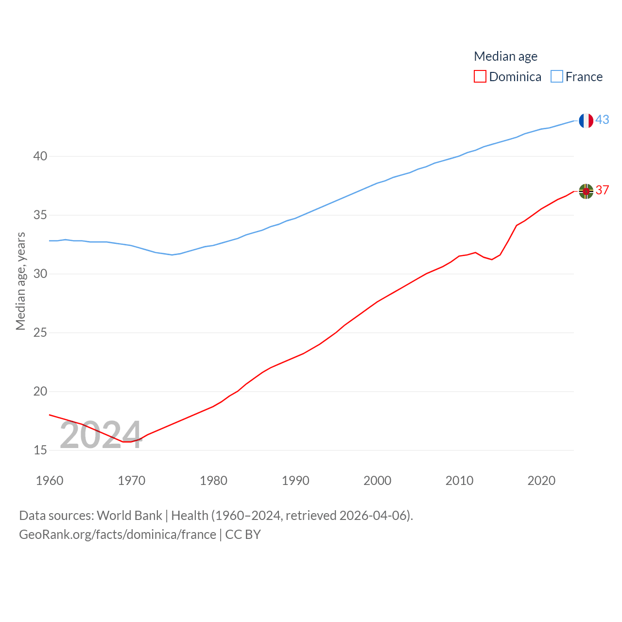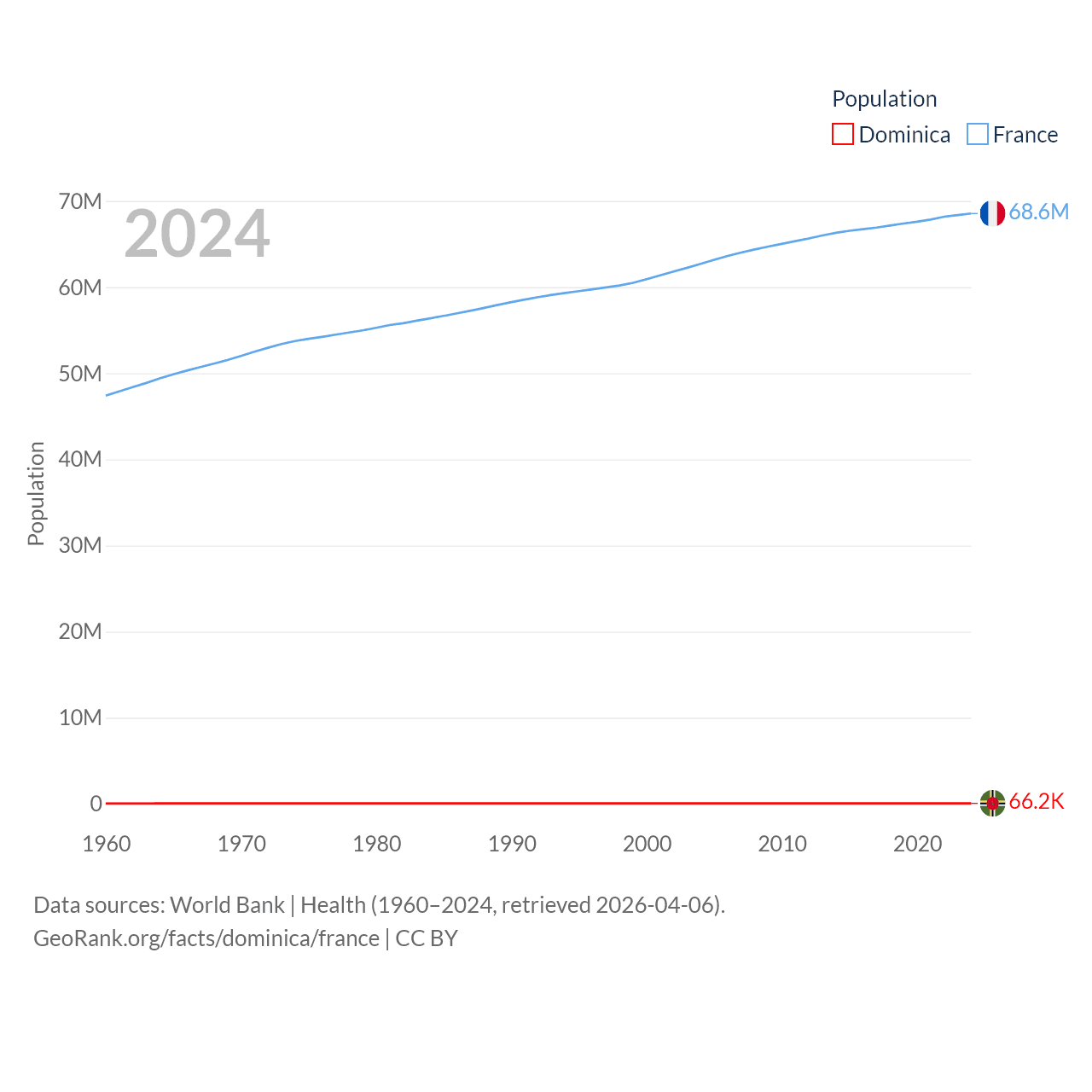 Dominica has a population of 66.2K (ranked 188/197), compared with 68.6M in France (ranked 23/197). Dominica's land area is 289.6 sq mi versus 208,090 sq mi for France (ranked 175th vs. 48th).